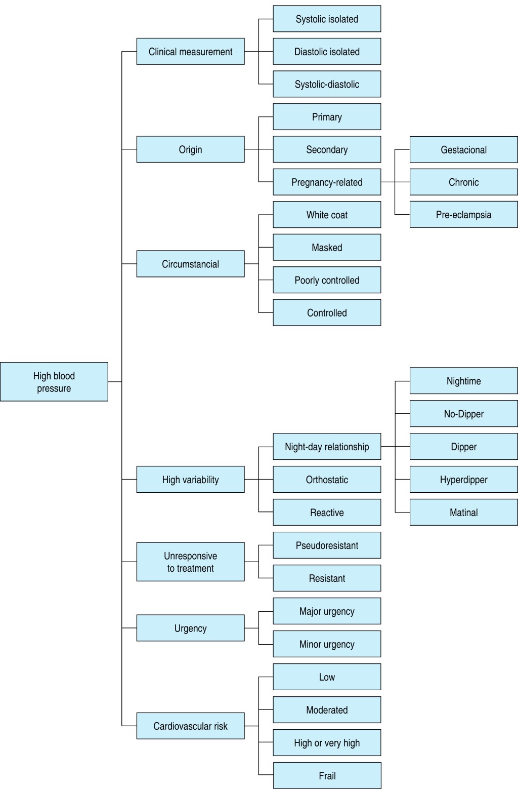En los pacientes con hipertensión arterial (HTA) podemos encontrar diferentes características que nos pueden ayudar a establecer el diagnóstico, el pronóstico y el tratamiento. Con el avance de la tecnología y el conocimiento de la fisiopatología de la HTA, ahora disponemos de otros métodos de diagnóstico fuera de la consulta que nos permiten medir la PA en diferentes circunstancias. Dentro de la HTA, los pacientes individuales pueden tener atributos de la enfermedad que, solos o combinados, describen fenotipos diferentes entre los individuos en relación con parámetros que tienen importancia clínica. Algunas de las principales características que identificamos son las relacionadas con la medición de la PA, con el origen de la elevación de la PA, con la circunstancia en la que se tomó la PA, con los pacientes con alta variabilidad de la PA, con los pacientes que no responden al tratamiento, con los pacientes en los que la elevación de su PA es una urgencia y con uno de los más importantes según el riesgo cardiovascular. A partir de estas características pudimos identificar 29 fenotipos diferentes de HTA en la literatura, que pueden ayudarnos a definir mejor el diagnóstico, el pronóstico y el tratamiento. Muchos autores y clínicos lo llaman "traje a medida"; sin embargo, nosotros lo llamaremos fenotipo hipertensivo.