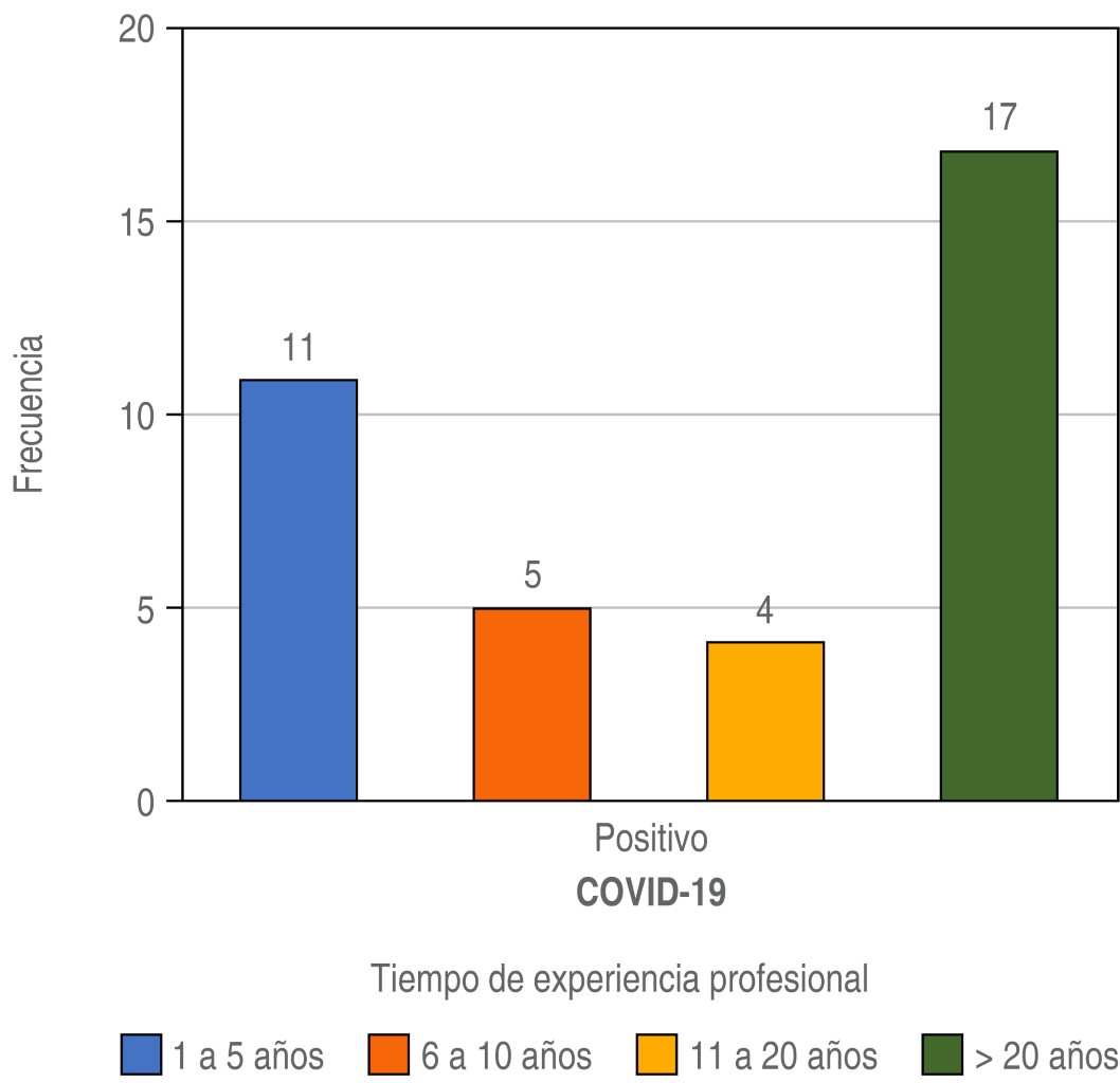 Nuestros resultados señalan que tener menor experiencia profesional ha sido determinante en el aumento del riesgo de contagio de la COVID-19, por lo que la información y el conocimiento sobre la etiopatogenia de la enfermedad y sobre los síntomas más frecuentes, así como la correcta aplicación de las pruebas son muy importantes para reducir este riesgo de contagios durante la práctica clínica, no sólo dentro del ámbito profesional, sino también de los pacientes.