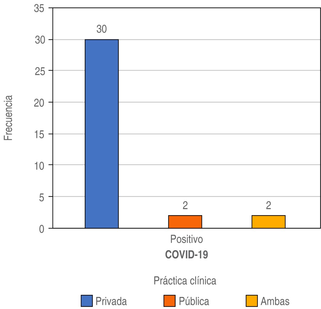 Respecto a la experiencia profesional se observó que la mayoría de los casos positivos se concentraron en los profesionales con uno a cinco años de experiencia y también en los que tenían 20 o más años (Figura 1). Las especialidades con casos positivos fueron prótesis, endodoncia y odontopediatría. Además de que se pudo observar que la gran mayoría de casos positivos se encontró entre los dentistas de práctica privada (Figura 2).