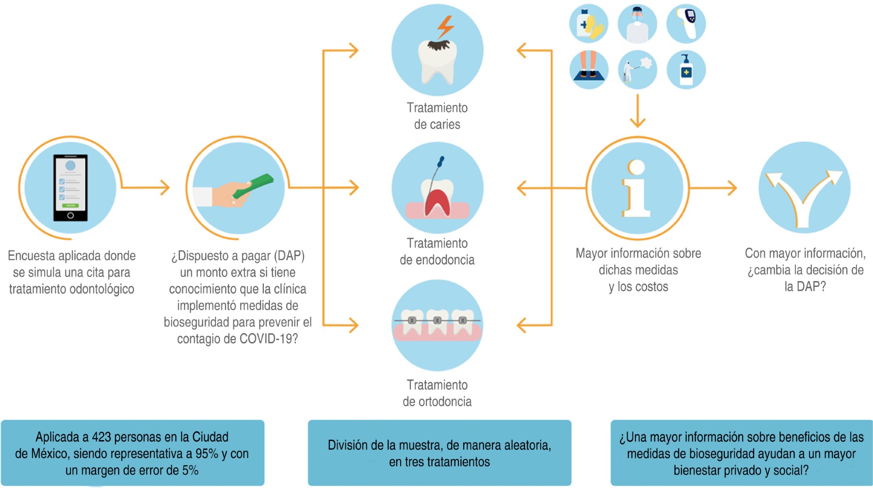 El estudio, a través de encuestas aplicadas a personas de los Estados Unidos Mexicanos, evidencia que aproximadamente 32% de los encuestados cancelarían su cita odontológica debido a la presencia del COVID-19; sin embargo, casi un 45% tendrían DAP un monto extra en la cita, si el consultorio o clínica donde asiste implementa medidas de bioseguridad, y aumentaría hasta un 58% si los encuestados tienen mayor detalle de las medidas implementadas, ventajas y desventajas, y de los costos en los que incurre la clínica.