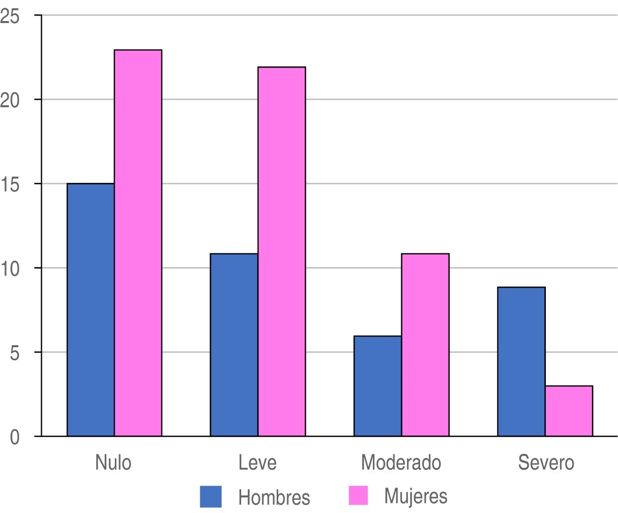 El promedio de edad fue de 21.6 ± 9.7 años; de la muestra total analizada 51% fueron mujeres y 49% hombres. El 62% presentó algún grado de apiñamiento (12% severo, 17% moderado y 33% leve) y 38% no presentó esta alteración. La distribución de la prevalencia del apiñamiento se dividió para los diferentes grados de severidad. El grado de apiñamiento leve y moderado se encontró en mayor proporción para las mujeres y el grado severo tuvo mayor prevalencia en el sexo masculino. Se utilizó la prueba χ2 para evaluar la relación entre el grado de apiñamiento y el sexo; sin embargo, no hubo asociación estadísticamente significativa (p > 0.05) (Figura 1).