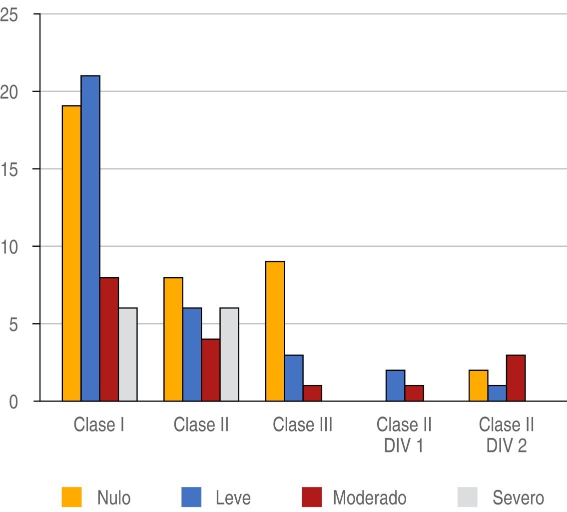 El grado de apiñamiento fue leve para la clase I, clase II, clase II división 1 y clase III; no obstante, para la clase II división 2 el grado de apiñamiento con mayor prevalencia fue el moderado. El grado de apiñamiento severo se encontró en la clase I y clase II, con un porcentaje de 6% para ambos casos. No se encontró una relación estadísticamente significativa entre el grado de apiñamiento y la maloclusión de acuerdo con la prueba χ2 (Figura 2).