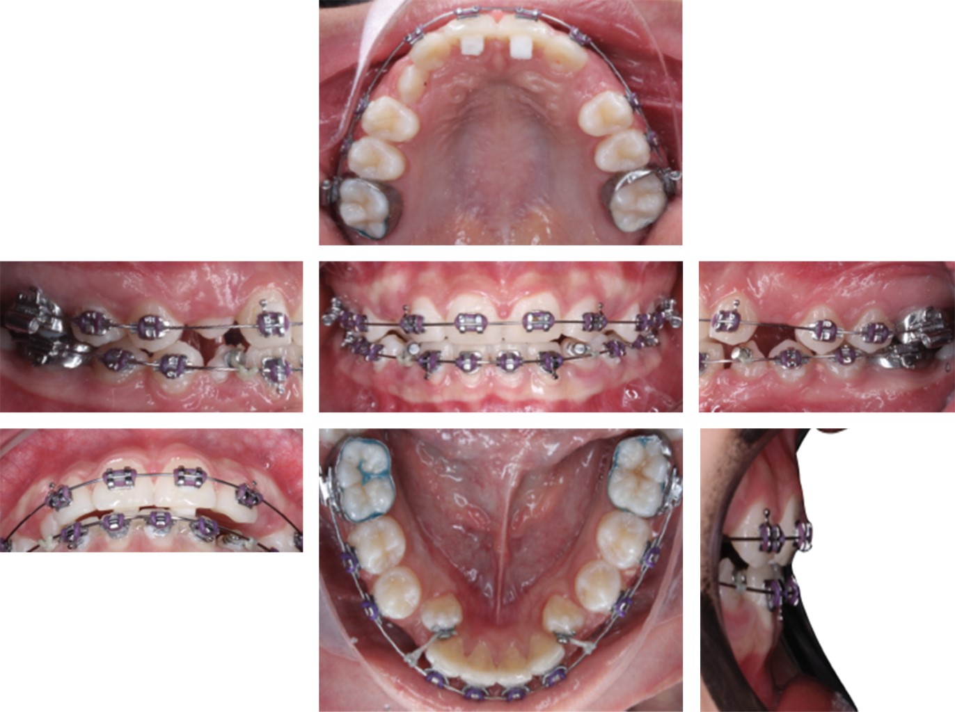Se decidió realizar el tratamiento sin extracciones con aparatología fija Alexander 0.018", colocación de bite turbo en incisivos centrales superiores para levantar la mordida anterior, arco superior e inferior 0.016" nitinol. Se derivó a interconsulta para extraer caninos temporales. Se cambió el arco inferior a 0.016" acero, cementación de botones en caninos inferiores para iniciar con la fase de alineación y nivelación dental junto con la tracción de caninos para integrarlos al arco (Figura 4). Colocación de arco 0.012" nitinol inferior, cementación de bracket en canino inferior izquierdo y botón por lingual de canino inferior derecho para enderezar el canino con mecánica de cupla.
