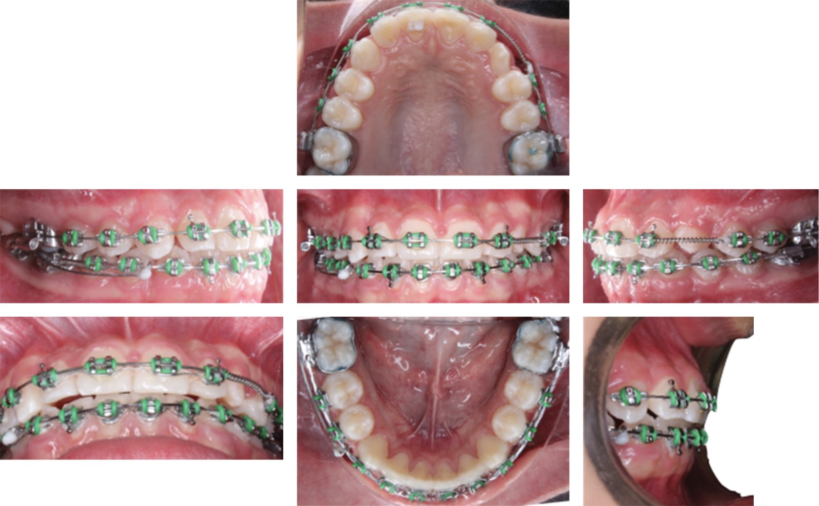 La fase de trabajo comenzó con arcos 0.016" × 0.022" acero superior y nitinol en inferior, posteriormente se puso un arco 0.017" × 0.025" acero superior, y la colocación de un resorte abierto entre incisivo lateral y primer premolar superior izquierdo manteniendo el espacio del canino. Se colocó tubo inferior derecho en segundo molar y se incorporó un cantilever de titanio molibdeno (TMA) para la corrección de posición (Figura 5). Remoción de resorte abierto y cantilever, y la colocación de bracket en canino superior izquierdo.