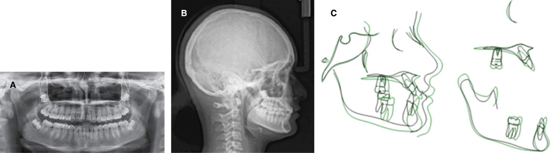 Se obtuvo una ligera proyección del labio superior e inferior en el perfil, la cual se asoció al remanente de crecimiento. Intraoralmente se consiguió la posición correcta de los caninos dentro de la arcada, estableciendo una guía canina y clase I molar, adecuada sobremordida horizontal y vertical, se mantuvieron las formas de arcos ovaladas (Figura 6B), se eliminó la curva de Spee y la verticalización del segundo molar derecho (Figura 7A). En el trazado cefalométrico el mayor cambio fue en los incisivos inferiores, ya que se encontraban retruidos (Figura 7B) y se obtuvo un IMPA de 95.7o (Tabla 1). En la superposición se pueden analizar los cambios esqueletales, dentales y faciales del paciente (Figura 7C). Con los cambios realizados, la paciente mostró mayor seguridad y satisfacción al sonreír.