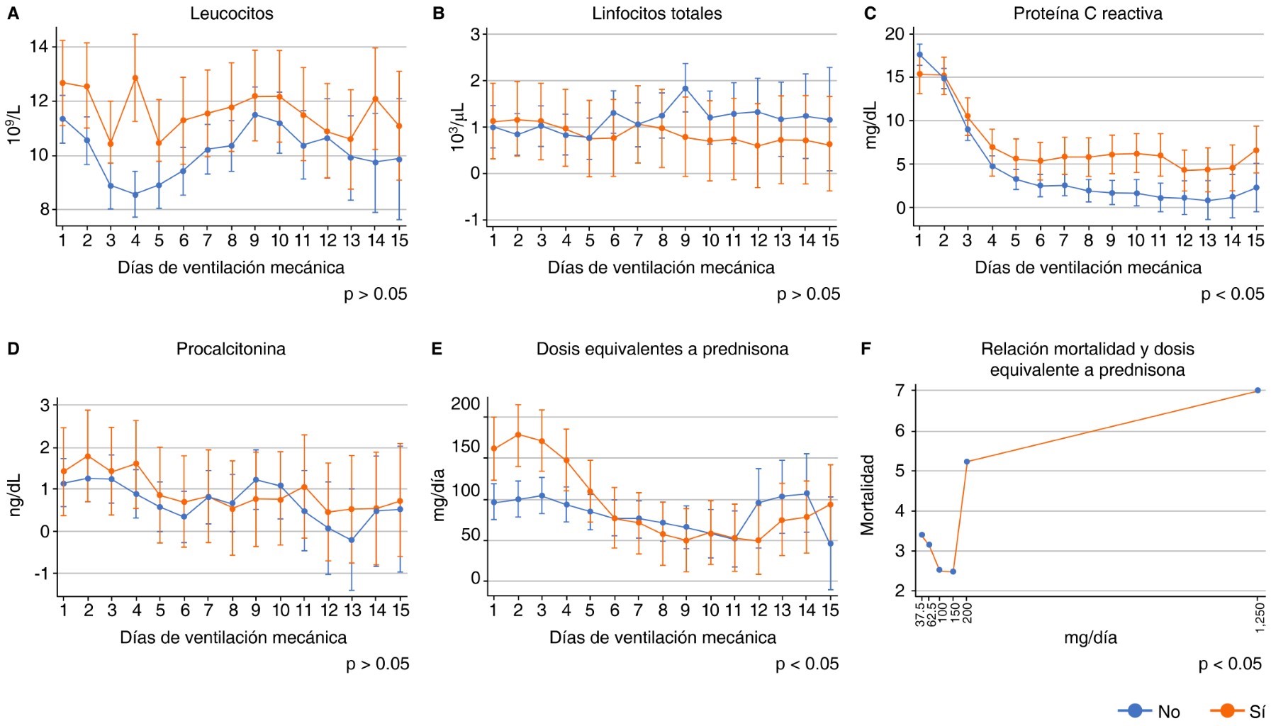 Análisis cronológico. Se realizaron regresiones lineales multinivel de efectos mixtos para reactantes de fase aguda (leucocitos, linfocitos, PCR y procalcitonina [PCT]) (Figura 1), parámetros ventilatorios (PDalv, Vt, Cstat y PEEP total) (Figura 2) y dosis equivalentes a prednisona (Figuras 1E a 1F). Sin encontrar diferencias estadísticamente significativas en niveles de linfocitos y PCT entre los grupos.