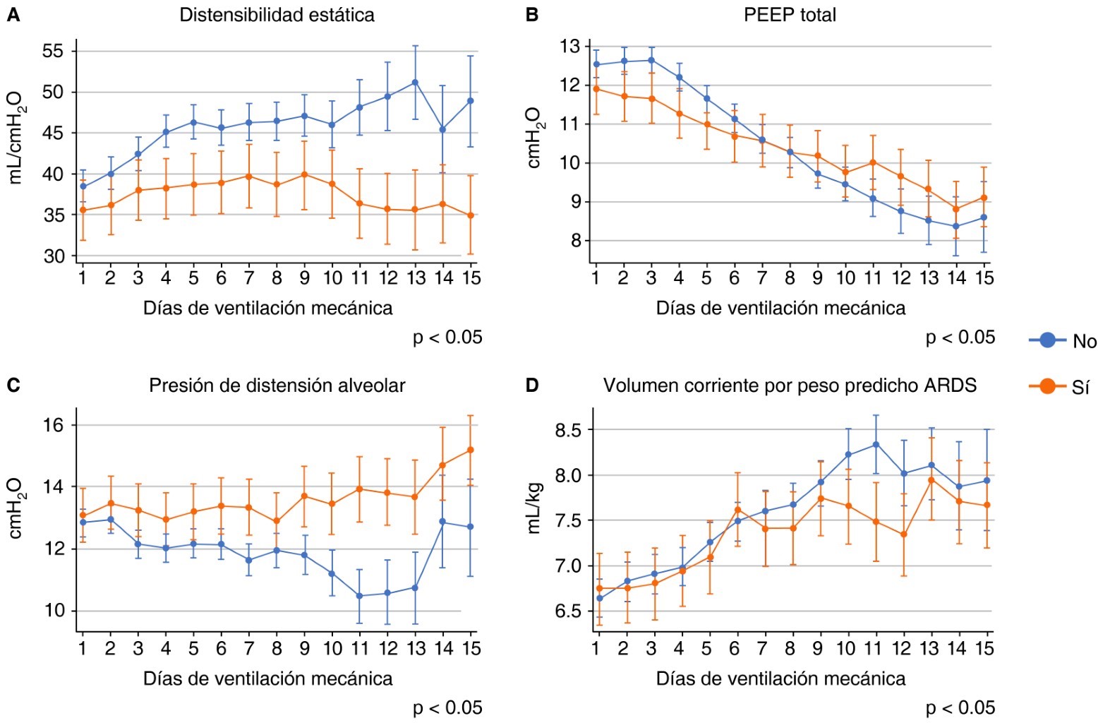 Asimismo, la relación entre niveles de SOFA y PDalv es notable, con un efecto por cada punto SOFA hay una elevación mínima de la PDalv de 0.135 ± 0.063 cmH2O (p = 0.045) por regresión no paramétrica de Kernel. La cantidad de PEEP total es mayor en el grupo de supervivientes, manteniéndose mayor a 12 cmH2O en los primeros cuatro días, con Cstat mayor a 40 mL/H2O desde el segundo día de VM, tolerando mayor Vt a partir del séptimo día de VM.