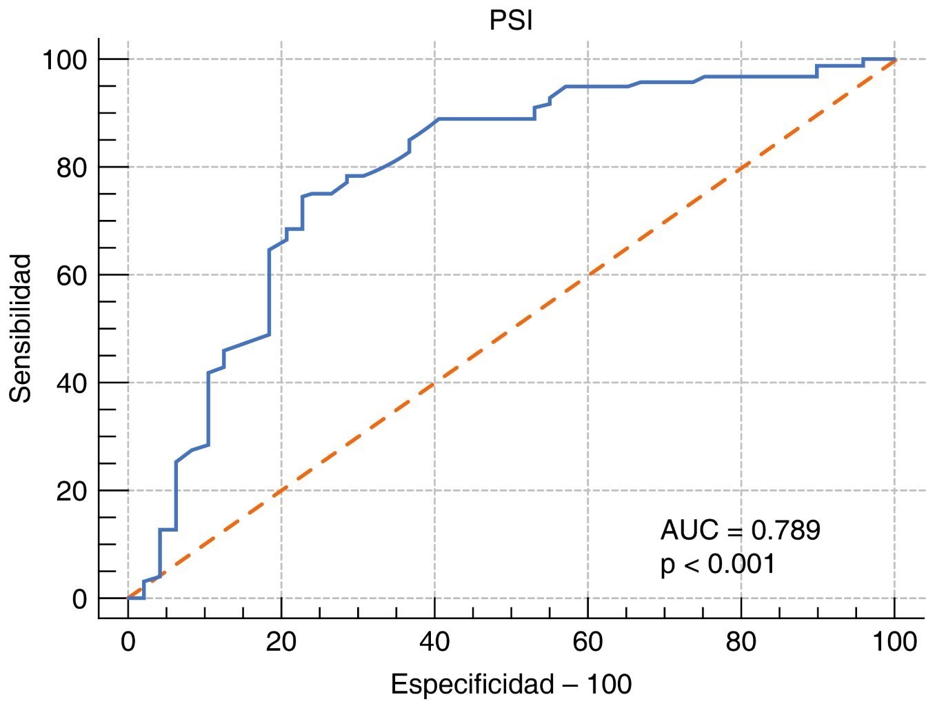 El punto de corte con mejores resultados en curvas ROC fue de > 70 puntos. Un puntaje PSI/PORT ≥ 71 (grupo III) tuvo una sensibilidad de 75.5%, especificidad 73.5%, VPP de 41.6% y un VPN de 92.3% para predecir uso de VMI (Tabla 4), con un AUC de 0.78 (IC 95% 0.71-0.85; p < 0.001) (Figura 2).