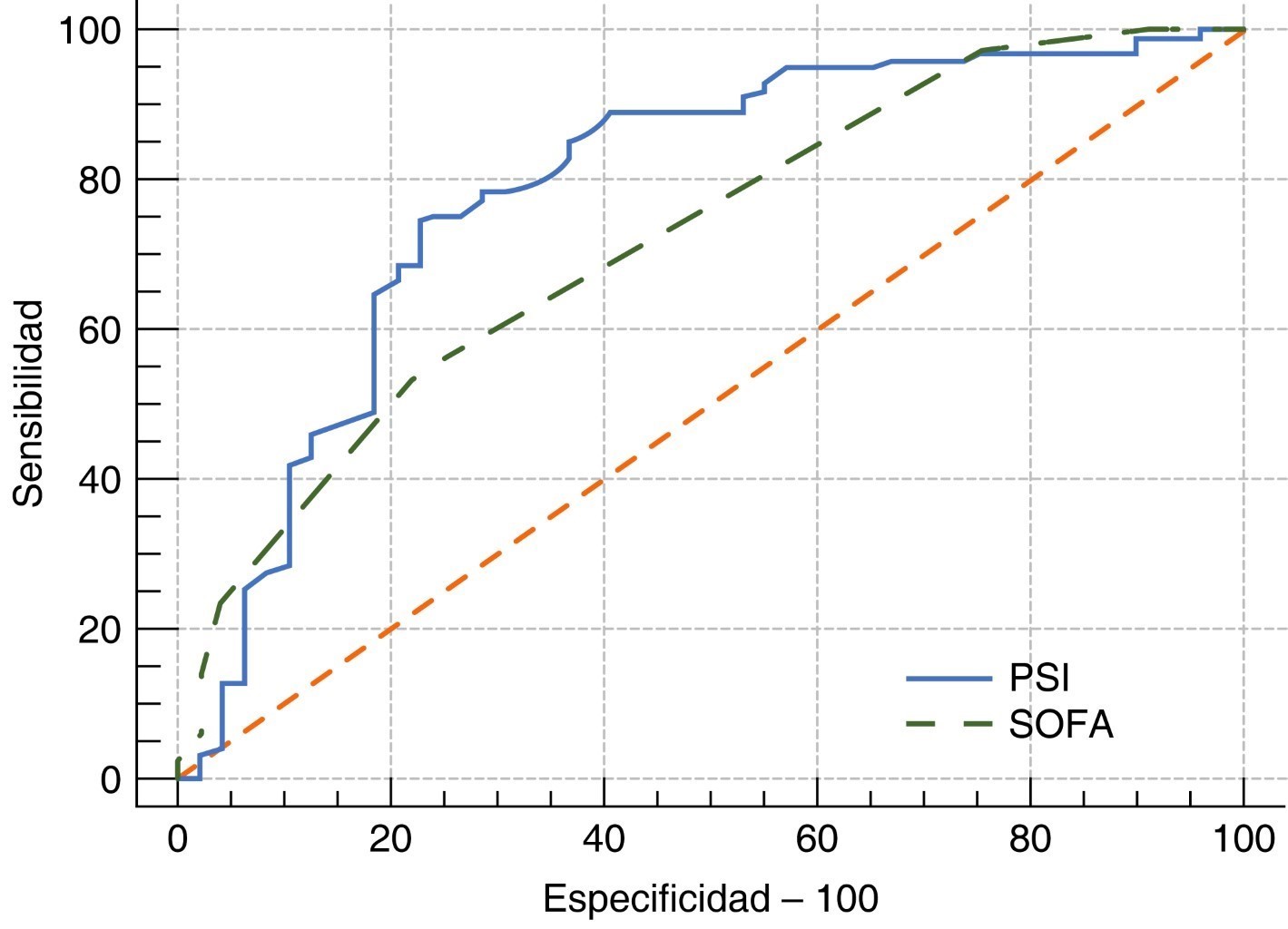 Un puntaje PSI/PORT ≥ 71 puntos mostró una mejor sensibilidad (75 contra 53%), valor predictivo positivo (41 contra 37%) y valor predictivo negativo (92 contra 87%), pero una menor especificidad (73 contra 77%) en la predicción de uso de VMI en comparación con una puntuación SOFA > 2. Sin embargo, al evaluar el desempeño de PSI/PORT y SOFA para predecir la necesidad de VMI se observó que ambas tuvieron un desempeño regular, ya que en el área bajo las curvas ROC fue < 0.8, y al comparar AUC no tuvieron diferencia significativa (p = 0.08).