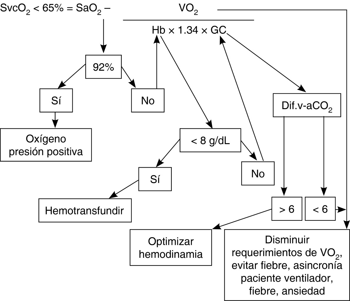 Si se cuenta con catéter venoso central (CVC) se puede medir la saturación de O2 en la sangre justo por encima de la aurícula derecha, lo que conocemos como SvcO2. Nosotros recomendamos el siguiente algoritmo para el análisis de los componentes de la saturación venosa central (Figura 1).