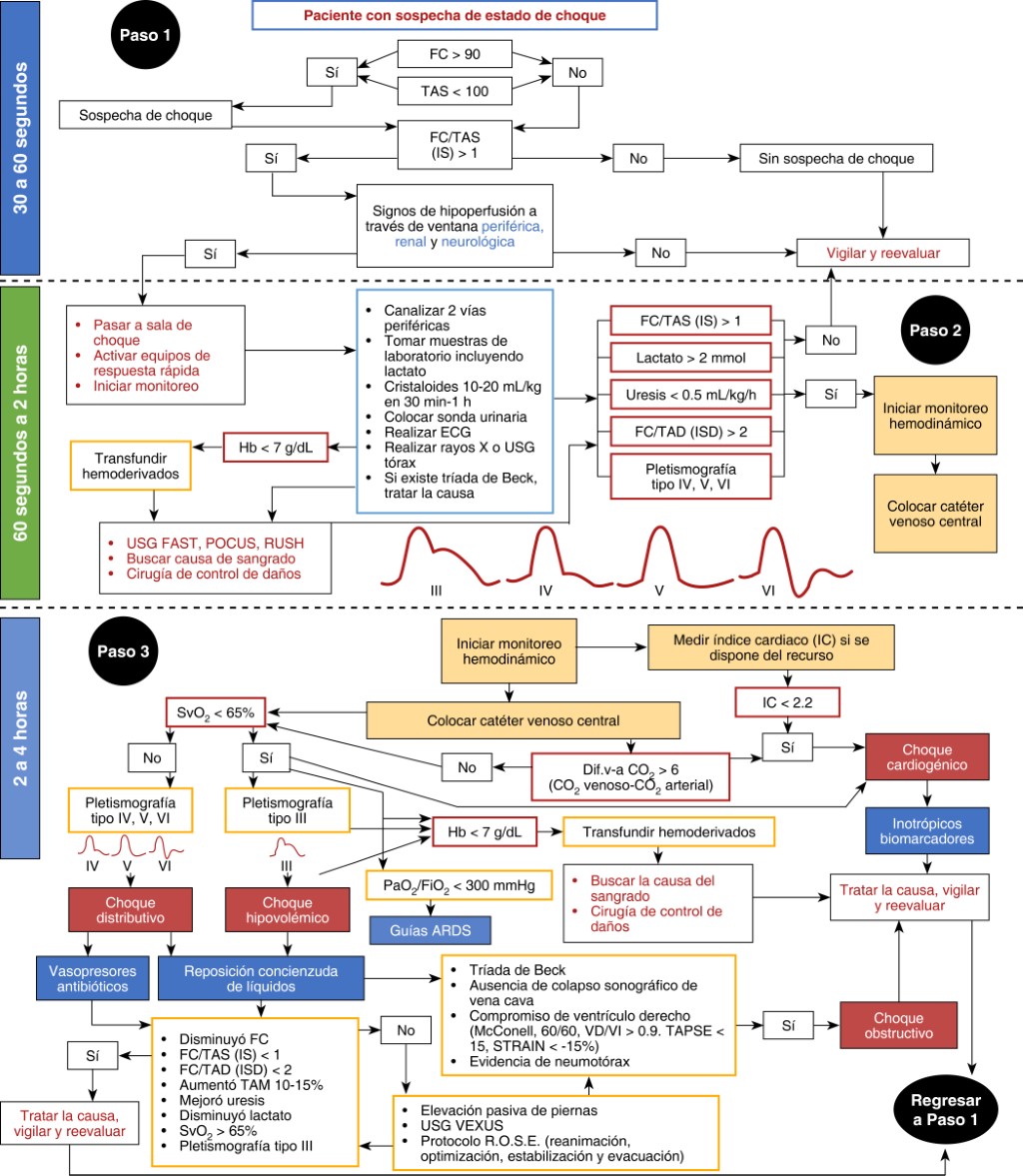 En el paso 2 (que va de los 60 segundos a dos horas) se hace abordaje diagnóstico y terapéutico, se canalizan dos vías periféricas y al mismo tiempo se toman muestras de laboratorio que incluyan hemoglobina (Hb), lactato, pruebas cruzadas y hemocultivo de dos sitios, se indican cristaloides (de preferencia Hartman o Ringer Lactato) en dosis de 10-20 mililitros/kilogramo (mL/kg) en 30 minutos a una hora y evaluando su respuesta, se usan auxiliares diagnósticos de rápido acceso como US, electrocardiograma (ECG), radiografías portátiles y se instala sonda urinaria con técnica estéril, si se identifica la causa del sangrado se hace cirugía de control de daños, si tiene Hb < 7 gramos/decilitro (g/dL) se transfunden hemoderivados, en la lista de verificación en caso de sospecha de hipovolemia o trauma se detiene la hemorragia y se administran 1,000 mL de Hartman en bolo, en caso de sospecha de sepsis abdominal se administran 500 mL de Hartman en bolo, sospecha de sepsis pulmonar 250 mL de Hartman en bolo, sospecha de falla cardiaca no dar bolo de cristaloides y tratar la causa, en caso de desnivel del segmento ST del ECG activar el protocolo de infarto agudo al miocardio, en caso de triada de Beck tratar la causa desencadenante. Si después de lo anterior hay mejoría, se le considera fuera ya del protocolo y se le mantiene en vigilancia y revaluación constante, pero si el IS continúa > 1, lactato > 2 mmol/L, uresis < 0.5 mililitros/kilogramo/hora (mL/kg/h), TLC > 3 seg, ISD > 2, onda PTG tipo IV, V o VI y persisten datos de hipoperfusión, entonces se continúa al siguiente paso y se inicia monitoreo hemodinámico avanzado.