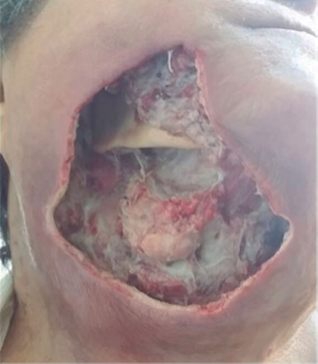 En el tratamiento inicial y de urgencia se realiza drenado de absceso mediante fasciotomía submandibular, dentro de los espacios aponeuróticos afectados, abarcando principalmente el submandibular y maseterino, paciente se mantiene en hospitalización con tratamiento antibiótico empírico doble esquema (ceftriaxona 1 g + clindamicina 600 mg) además de soporte sistémico base para sus patologías crónicas. Se realizan otros tres lavados y debridaciones de fasciotomía en los que se observa aparente mejoría de proceso infeccioso ya que hay ausencia de secreción purulenta; sin embargo, en fasciotomía se observan datos de sufrimiento tisular principalmente en bordes de herida quirúrgica, además de datos clínicos de necrosis evidentes a nivel muscular tales como cambio de coloración (Figura 1).