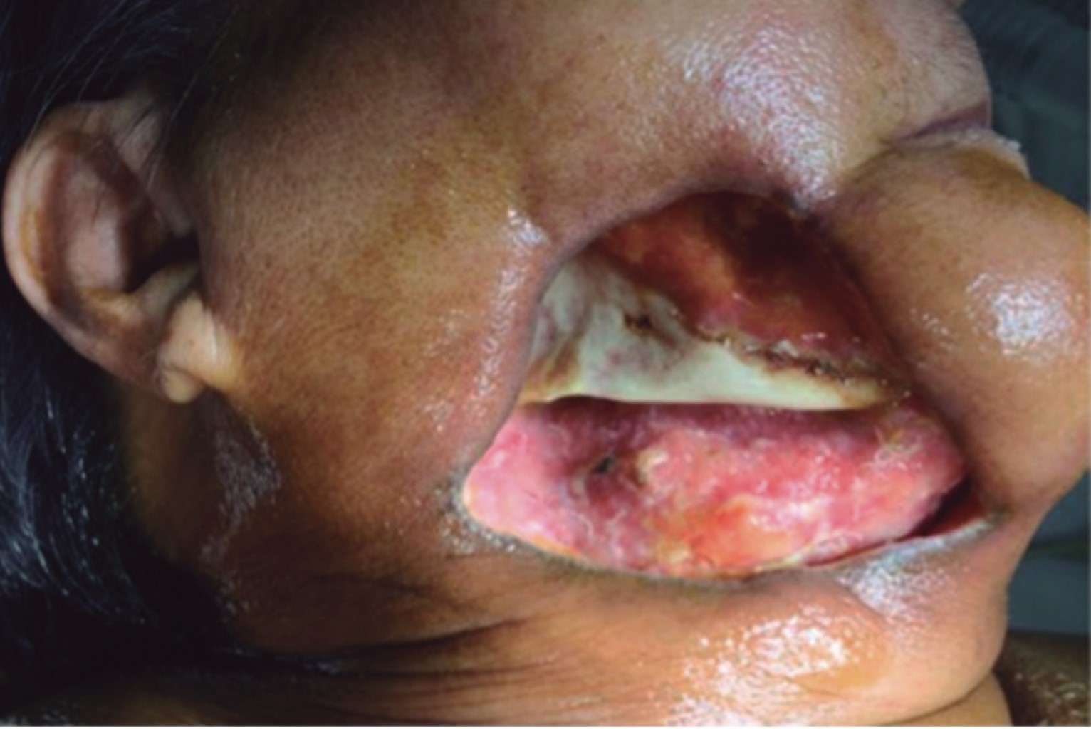 La fascitis necrosante de cabeza y cuello es una infección de tejidos blandos poco frecuente, de rápida propagación, de origen polimicrobiano, caracterizada por una necrosis extensa y formación de gas en el tejido subcutáneo y la fascia superficial. Con la progresión de esta enfermedad, se producen mionecrosis y moteado de la piel debido a la trombosis de los vasos de alimentación cuando pasan a través de los planos fasciales infectados. Las infecciones dentales son la causa más común de esta patología.1