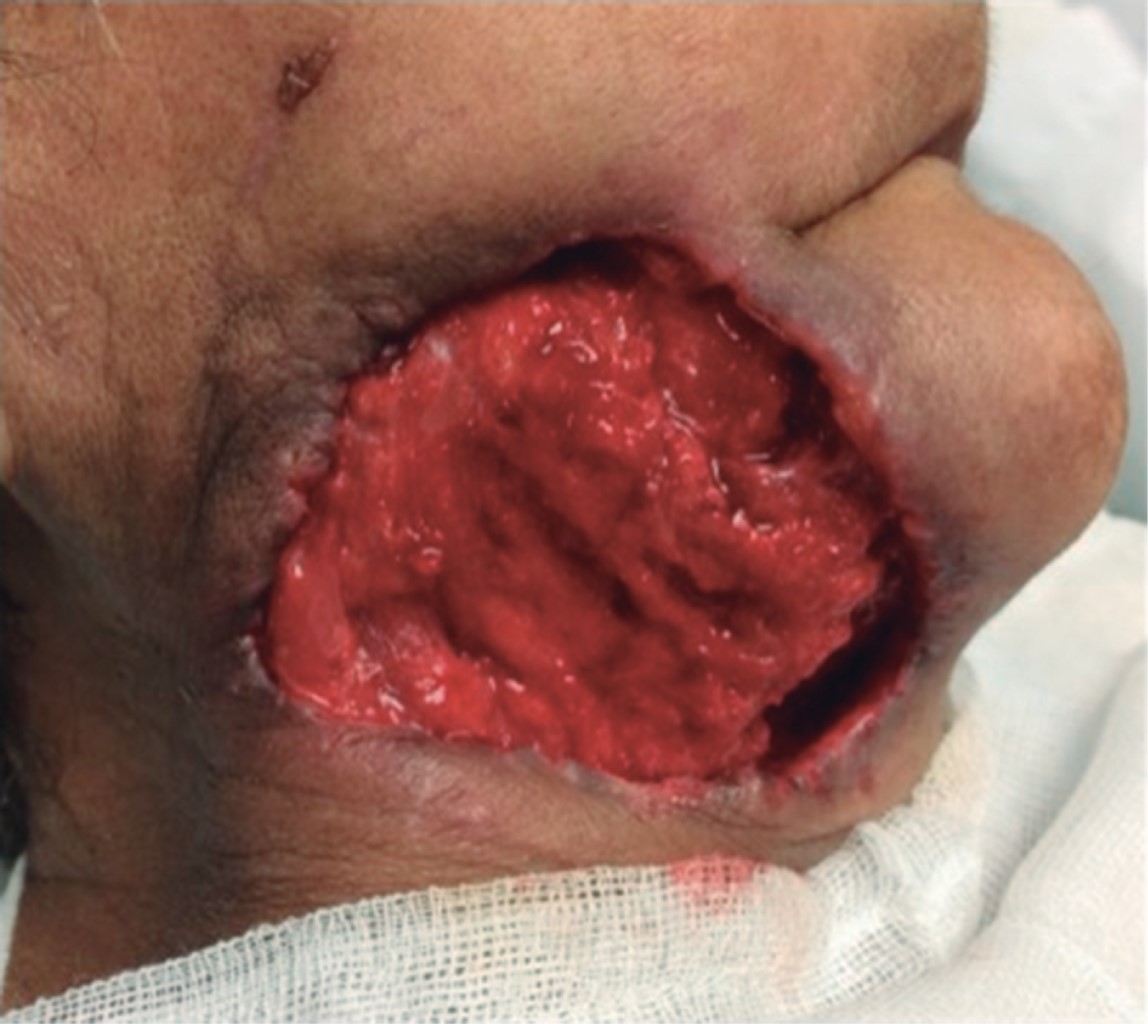 Mediante este caso clínico pretendemos ilustrar cómo un gran defecto cervical, con tejido desvitalizado amplio, ha podido ser tratado mediante un colgajo de pectoral mayor, el cual ofreció una alternativa de restauración miocutánea adecuada para las características de nuestro paciente, esto a pesar de la desafortunada necrosis tisular presentada, la cual pudo ser corregida con un tratamiento a base de plasma rico en plaquetas, está comprobado que esta alternativa terapéutica puede ser utilizada en este y otros tipos de defectos y que será motivo de análisis para futuras publicaciones.