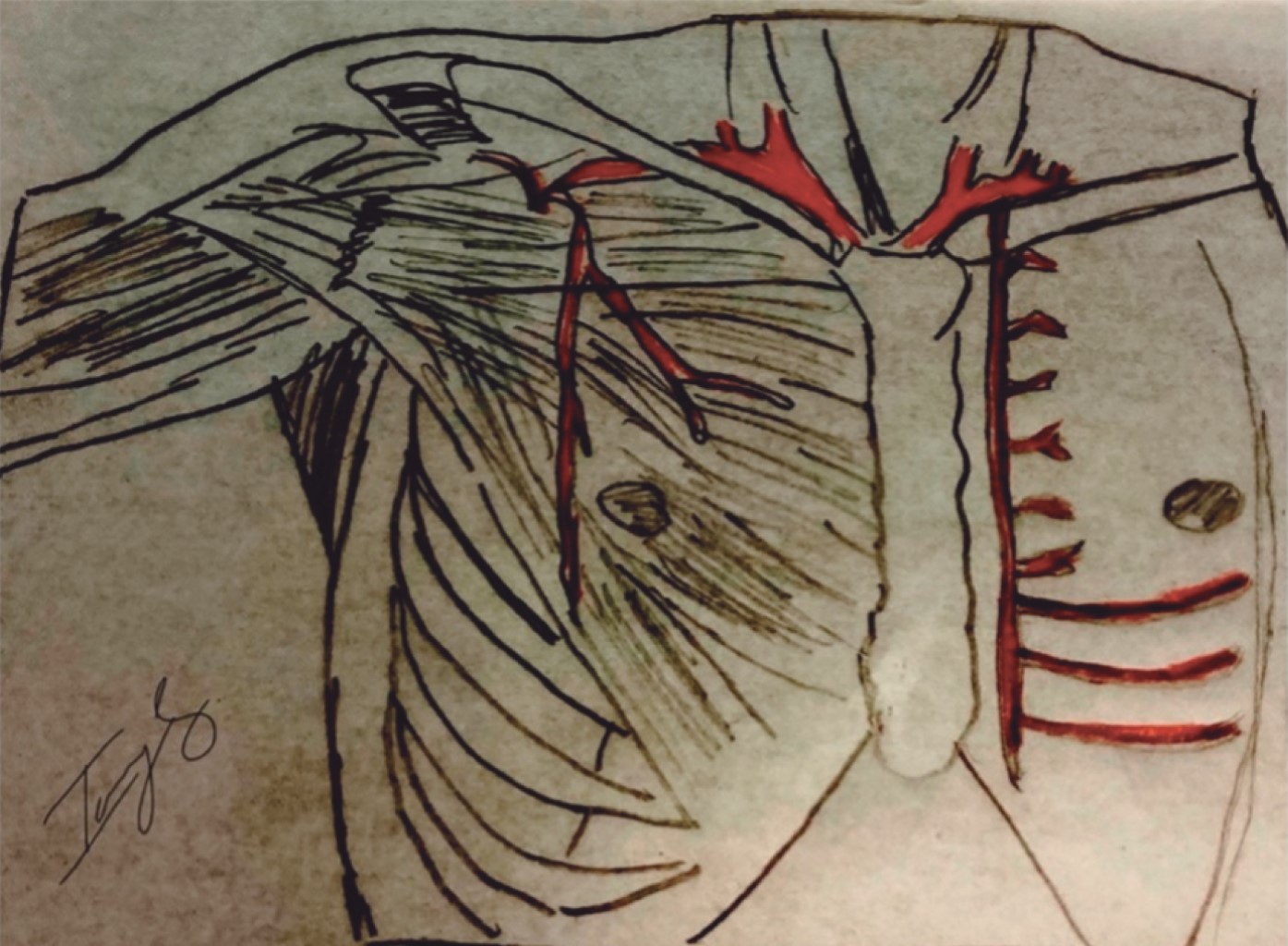 El pedículo vascular corre verticalmente a lo largo de una línea trazada desde el acromion hasta la apófisis xifoides. La paleta de piel debe marcarse en la porción inferomedial del colgajo correspondiente al tamaño del defecto. Haga una incisión curva en forma de C para abarcar la paleta de piel y permitir que el pecho y la piel se eleven de la pared torácica. Esta incisión permite la preservación de vasos (perforantes mamarias internas) para un colgajo deltopectoral en caso de cualquier compromiso vascular del pedículo o cuando se necesita el colgajo deltopectoral como medida complementaria. Una vez que se identifica el músculo, se identifica la cara inferolateral del colgajo muscular y se ingresa al plano entre el pectoral mayor y el menor generando una disección completa.