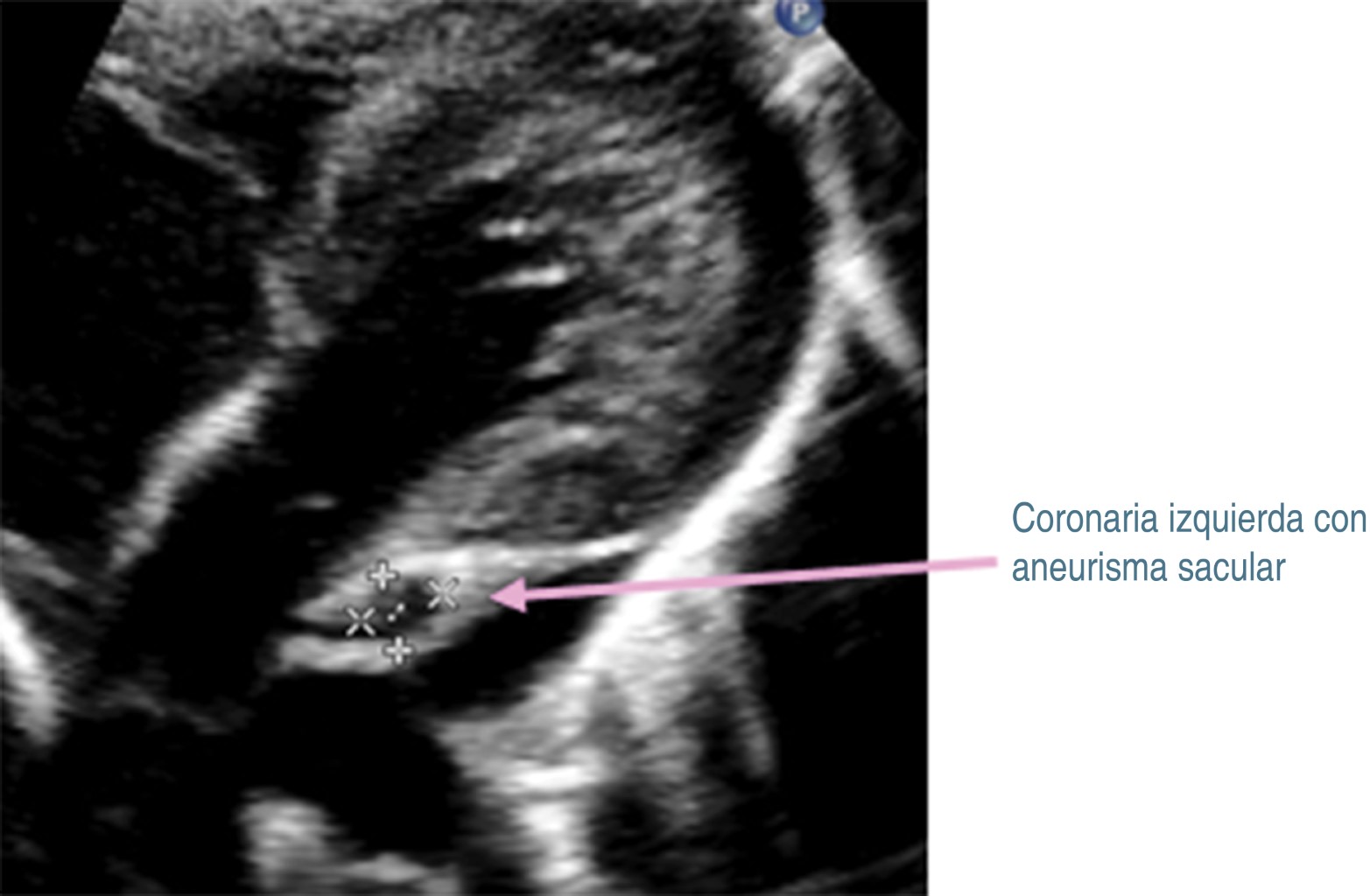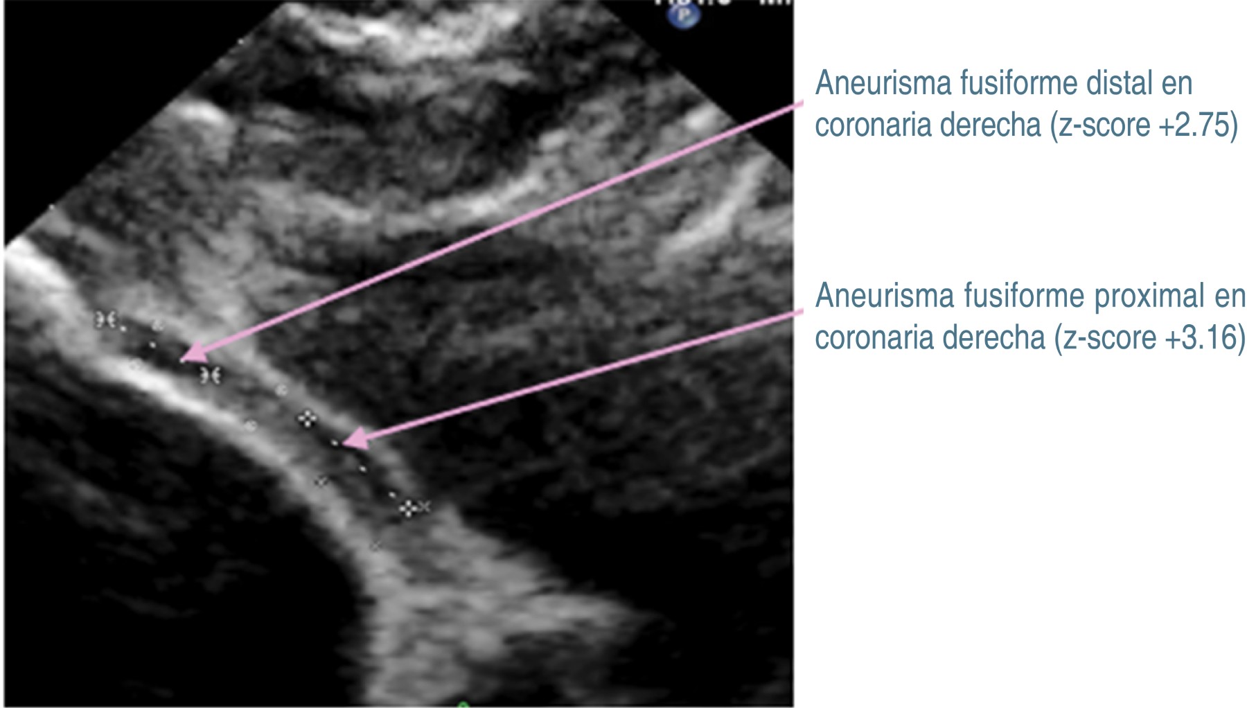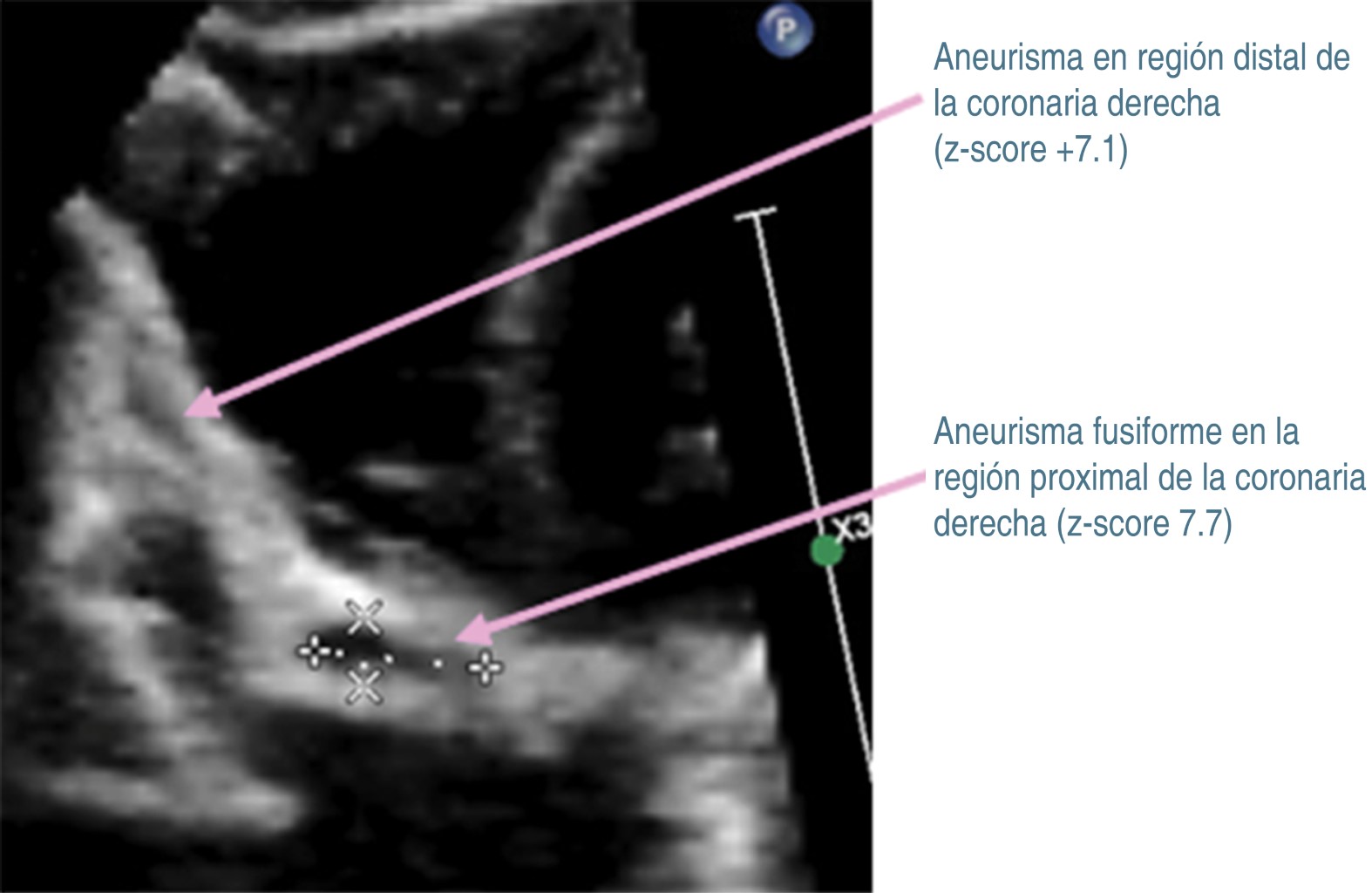 Los aneurismas de las arterias coronarias (AAC) son las complicaciones más importantes de la EK. Se describen dos diferentes tipos de aneurismas, los saculares y fusiformes. Los primeros se caracterizan por presentar lesión en la íntima, media y elástica; la adventicia puede romperse o formar trombos, o bien se organiza, calcifica y origina estenosis. En el caso de los fusiformes, su característica es preservar la trombosis y desencadenar estenosis mural progresiva. Ambos tipos de aneurismas se encontraron en nuestro paciente, los cuales son extremadamente raros en niños menores de tres meses de edad; por su dimensión, no se consideraron gigantes, ya que el z-score no fue mayor a 8 mm. Los aneurismas gigantes se consideran de mal pronóstico, ya que pueden conducir a trombosis coronaria, estenosis o infarto de miocardio, lo cual ocurre hasta en el 73% de los pacientes durante el primer año de la enfermedad.7