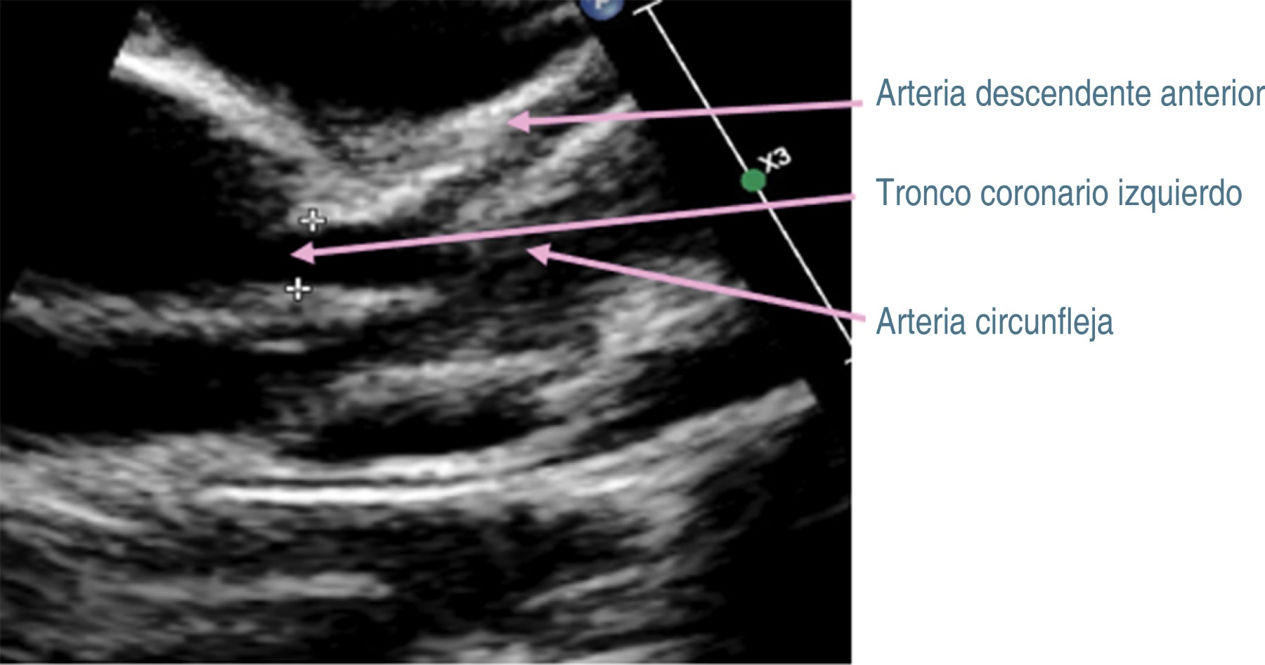 Los datos previos orientaron a que se trataba de EK, por lo que se inicia inmunoglobulina intravenosa (IGIV) humana a dosis de 2 g/kg/día, ácido acetilsalicílico (ASA) a dosis de 80 mg/kg/día, clopidogrel (0.5 mg/kg/día) y enoxaparina (1 mg/kg/dosis). La fiebre cede en las primeras 24 horas, presentando mejoría del estado general. Cinco días después, en ECT de control, el tronco coronario izquierdo medía 3.9 mm (z-score +7.05), sin evidencia de trombo en su interior. Mientras que en la coronaria derecha hay regresión de aneurismas fusiformes a aneurismas pequeños, midiendo 2.4 × 5.4 mm en porción proximal (z-score + 3.16), y de 1.9 × 4.5 mm en porción distal (z-score + 2.75) (Figura 3). En el tronco coronario izquierdo medía de 3.9 (z-score + 7.05), sin evidencia de trombo (Figura 4).