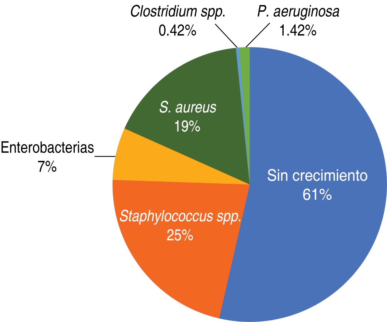 Los otros microorganismos que mostraron crecimiento fueron las enterobacterias con incidencia de 7%, de éstas la Clostridium spp. con 0.42% y la Pseudomonas aeruginosa con 1.42%; estos tejidos contaminados son rechazados y destruidos.