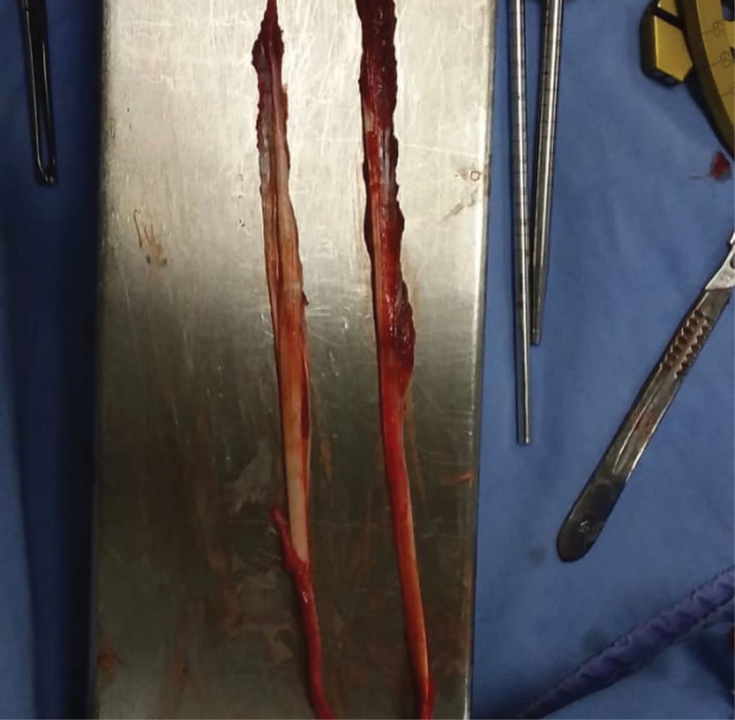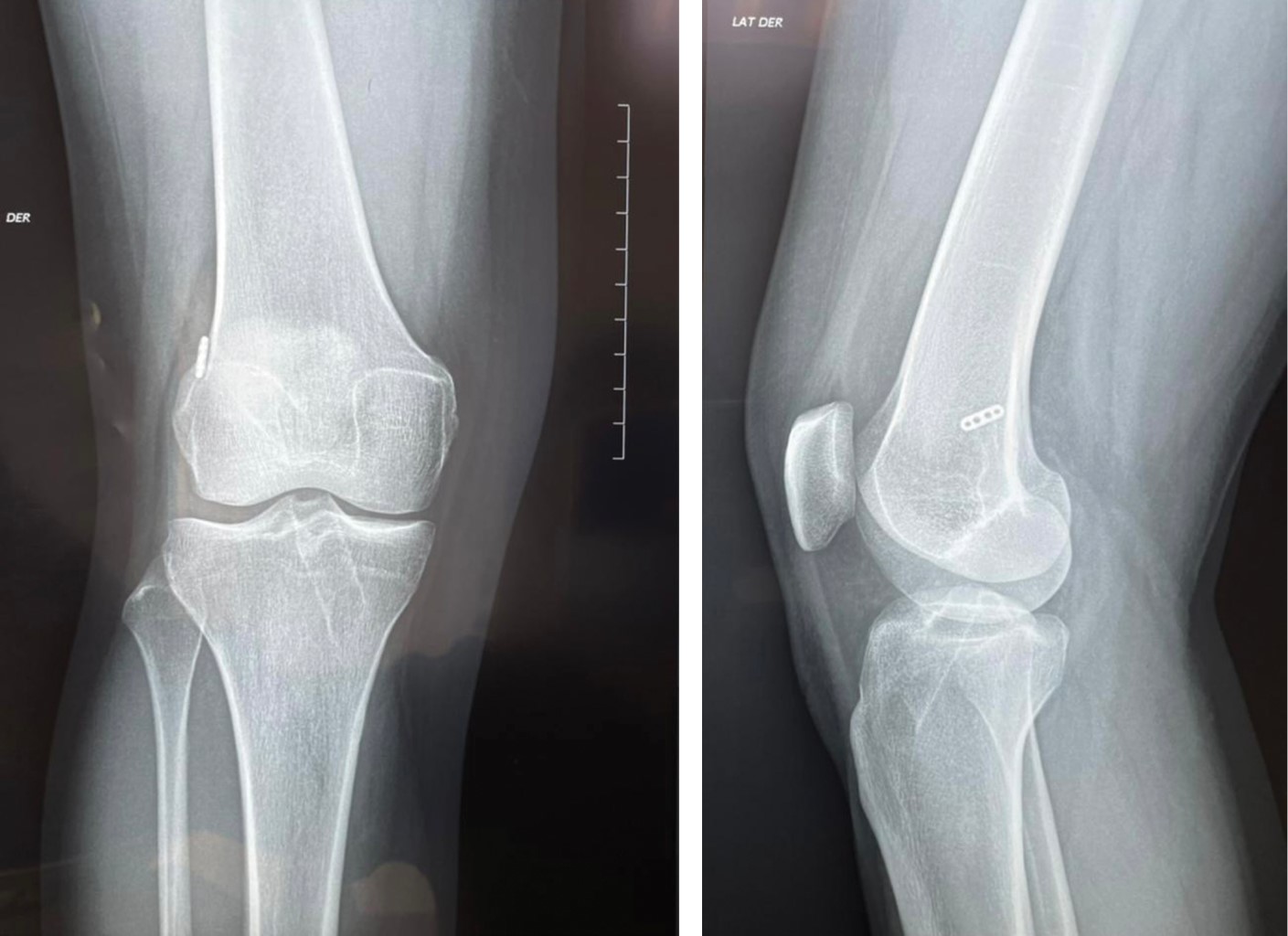 Se incluyeron 32 pacientes que se sometieron a reconstrucción del ligamento cruzado anterior con autoinjerto de isquiotibiales (Figuras 3 y 4), siendo 90.6% del sexo masculino, todos son de un nivel socioeconómico medio y tienen una baja participación deportiva en su vida diaria. La edad promedio del grupo estudiado fue de 27.7 ± 7.3, con un rango de 17 a 45 años. La talla promedio fue de 173.4 ± 6.9 cm. y el peso fue de 84.5 ± 16.4 kg, respecto al índice de masa corporal, fue de 28.15 ± 5.4 kg/m2, 21.9% de pacientes padece obesidad tipo II, 62.5% (n = 20) presentó lesión en su rodilla derecha, 53.1% (n = 17) se sometió a técnica quirúrgica con abordaje anteromedial y 46.9% (n = 15) abordaje transtibial. Sólo un paciente reportó tener una comorbilidad, hígado graso.