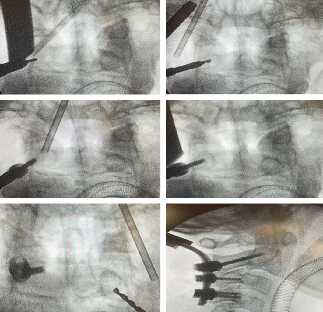 En nuestra técnica la colocación del tornillo transpedicular en C2 es determinada de forma cuidadosa por la valoración preoperatoria de las imágenes tomográficas. La instrumentación guiada por la fluoroscopia intraoperatoria en proyección anteroposterior es una técnica segura y fácil de reproducir. Ésta nos permite identificar la zona y el punto de entrada al pedículo, la trayectoria dinámica de los tornillos en su ángulo medial y sagital de acuerdo con la anatomía particular de cada paciente y así evitar lesiones inadvertidas de la médula espinal y de la arteria vertebral intraaxial.
