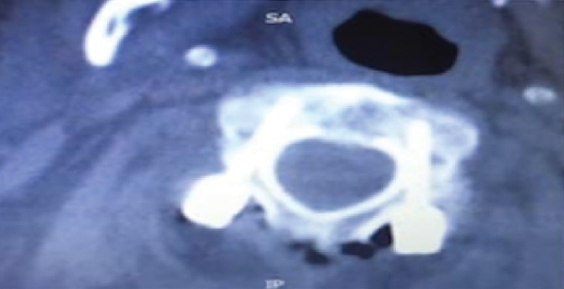 Se realizó estudio tomográfico simple de columna cervical en todos los pacientes. Se analizó la tomografía computarizada en dos dimensiones como lo describieron Marco y cols., en proyección sagital. Se utilizó la clasificación tomográfica de Lee y cols. para clasificar los tres tipos de la arteria vertebral intraaxial y determinar el riesgo bajo, medio o alto de lesión vascular. Además, se usó la clasificación por grados de Neo y cols. en el estudio tomográfico postquirúrgico para evaluar la posición de los tornillos transpediculares en C2.