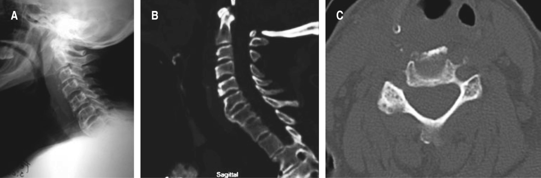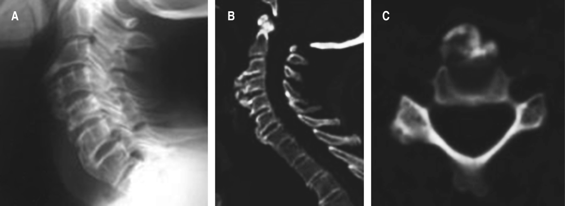 Para investigar la causa de la disfagia se realizaron radiografías de columna cervical, tomografía computada, videodeglución realizada por el Servicio de Fonoaudiología y una fibrolaringoscopia realizada por el Servicio de Otorrinolaringología. Estos estudios mostraron osteofitos en la cara anterior de la columna cervical a nivel de C3, C4 y C5 fusionados entre sí y a nivel de C6 y C7 (Figura 1).