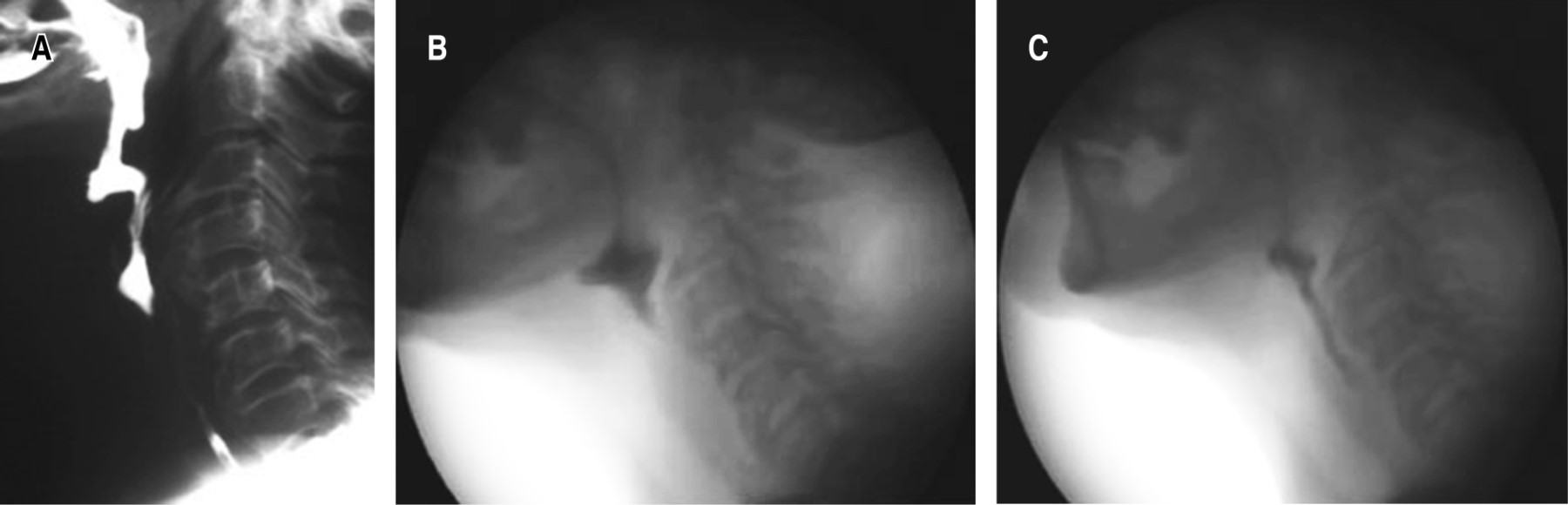 La videodeglución mostró una detención del contraste justo por encima del osteofito de C3, que se corresponde con la zona de la epiglotis, evidenciándose además que una escasa cantidad de contraste se dirigía a la vía aérea (Figura 2).