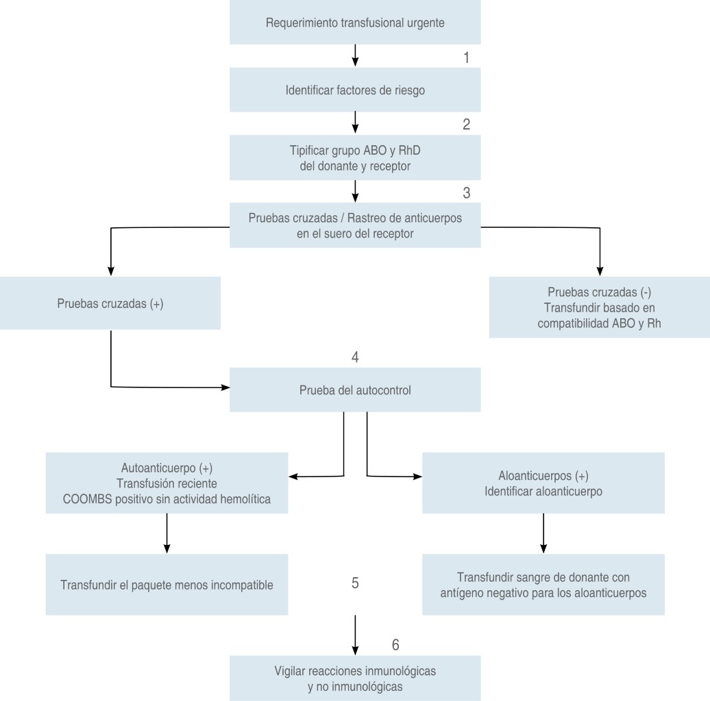 El soporte transfusional urgente representa una práctica cada vez más común en áreas críticas, por lo tanto, el abordaje de estudio de la compatibilidad sanguínea y las opciones terapéuticas en caso de incompatibilidad deben ser bien identificadas por los médicos no hematólogos para poder elegir en situaciones graves la mejor estrategia que represente el menor riesgo. Hacemos una revisión del protocolo de atención paso a paso en casos de incompatibilidad y nos enfocamos en las opciones terapéuticas que han demostrado ser seguras en la atención de pacientes críticos, sobre todo en situaciones clínicas de urgencia, pues no está descrito hasta el momento ningún protocolo de actuación que regule el soporte transfusional en estos escenarios clínicos."Hombre de 38 años de edad previamente sano, sometido dos meses previos a apendicetomía de urgencia por apendicitis complicada, requiriendo en el periodo postquirúrgico inmediato la administración de dos concentrados eritrocitarios compatibles y tipificados para hemotipo O rh positivo. Es traído al departamento de urgencias tras presentar múltiples lesiones contusas y trauma abdominal cerrado durante un accidente automovilístico. En la evaluación inicial refiere dolor intenso en hipocondrio derecho y lumbar del mismo lado, la tensión arterial determinada al ingreso fue de 80/50 mmHg, frecuencia cardiaca de 136 latidos por minuto, 25 respiraciones por minuto y la temperatura de 36 grados centígrados. El índice de choque fue de 1.7. En el ultrasonido abdominal enfocado (ecografía FAST) se identifica líquido libre abdominal y los estudios de laboratorio muestran anemia grave. En sospecha de hemoperitoneo se decide realizar laparotomía exploratoria de urgencia. Previo al procedimiento se inicia manejo con cristaloides y apoyo vasopresor y se solicita a Banco de Sangre cuatro concentrados eritrocitarios para hemotipo O rh positivo. Tras realizar múltiples pruebas se reporta incompatibilidad para todos los hemoderivados disponibles".