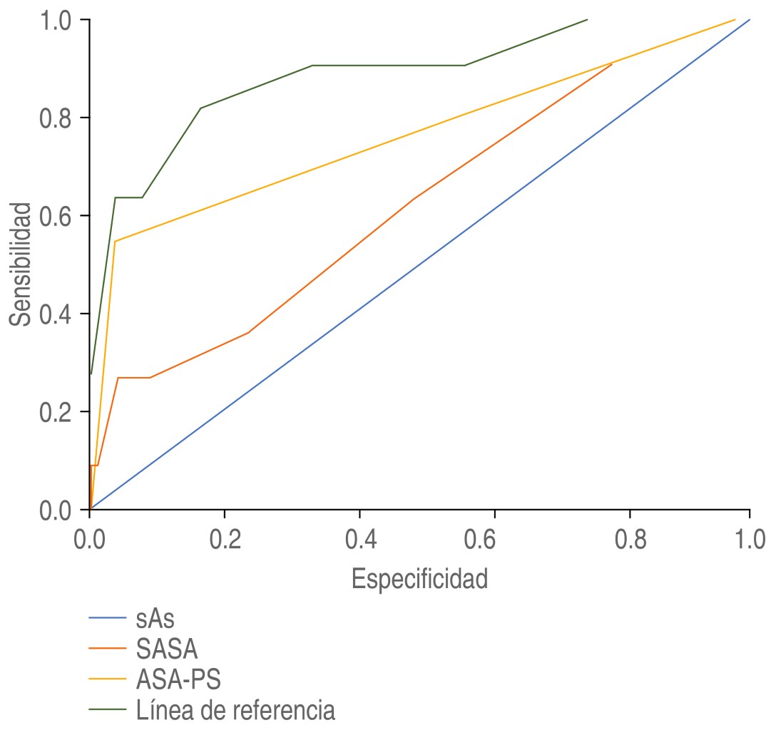 El riesgo de mortalidad fue mayor cuando se obtuvieron puntuaciones más altas en la escala ASA-PS. Lo contrario sucede con el sAs y SASA, donde la puntuación más baja indica condiciones más graves en el paciente y la mortalidad tiende a aumentar significativamente. Sin embargo, en este análisis de riesgo (OR), la peor escala fue ASA-PS, ya que no obtuvo un valor de p significativo, y el intervalo de confianza se encontró a ambos lados de la unidad. Las curvas ROC demostraron individualmente que ASA-PS, el sAs y SASA fueron válidas para estimar la mortalidad a los 30 días del postoperatorio; pese a ello, el sAs obtuvo el área más pequeña bajo la curva con un valor de p no significativo. Los valores exactos y en relación con el área bajo la curva se presentan en la Tabla 4.