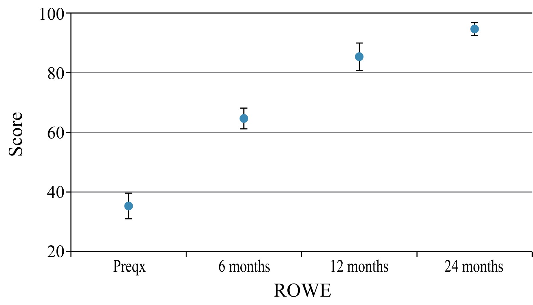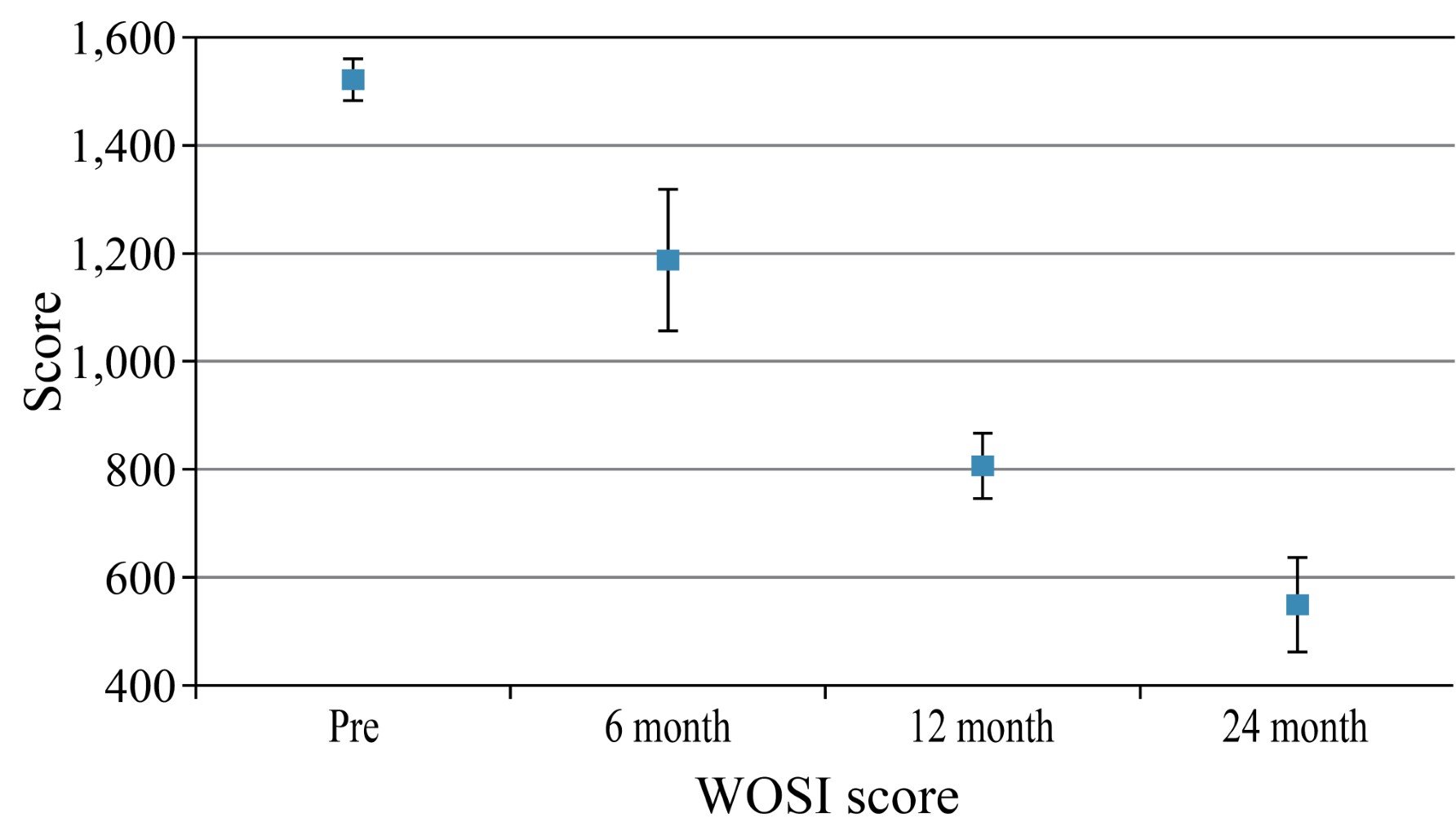Resultados: Evaluamos cinco mujeres (35%) y nueve hombres (65%) con una edad media de 39.1 (± 14) años. Diez involucraron el hombro derecho (71.4%) y cuatro el izquierdo (28.5%). Los resultados de las escalas WOSI y ROWE fueron estadísticamente significativos (p ≤ 0.05) en las evaluaciones postquirúrgicas como en todos los períodos analizados en contraste con el prequirúrgico. Los componentes de la prueba WOSI también se vieron por separado (deportes, estilo de vida, emoción y síntomas físicos) para evaluar si alguno de ellos por separado podría haber alterado o influido en la puntuación total obtenida, pero encontramos significancia estadística (p ≤ 0.05) en todos los parámetros. No hubo recurrencia ni complicaciones hasta el último seguimiento.