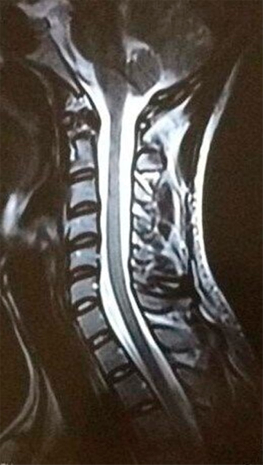 Es valorado por los servicios de neurología y neurocirugía descartando tratamiento quirúrgico. Tres días después se encuentra paciente con evolución clínica favorable, con funciones mentales superiores normales, debilidad distal en extremidades, escala Daniels 4/5, Hoffman y Trommer positivos, reflejos osteotendinosos aumentados en miembros inferiores; Babinski, Chaddock y Gordon ausentes; con adecuada diuresis. Se decide continuar con esteroides IV y se realiza resonancia magnética simple con resultados de pérdida de la lordosis cervical; sin presencia de alteraciones que condicionen compromiso de cordón medular o alguna otra anormalidad (Figura 1). Se concluyó diagnóstico clínico de SCIWORA asociado a Sx de Brown Séquard.