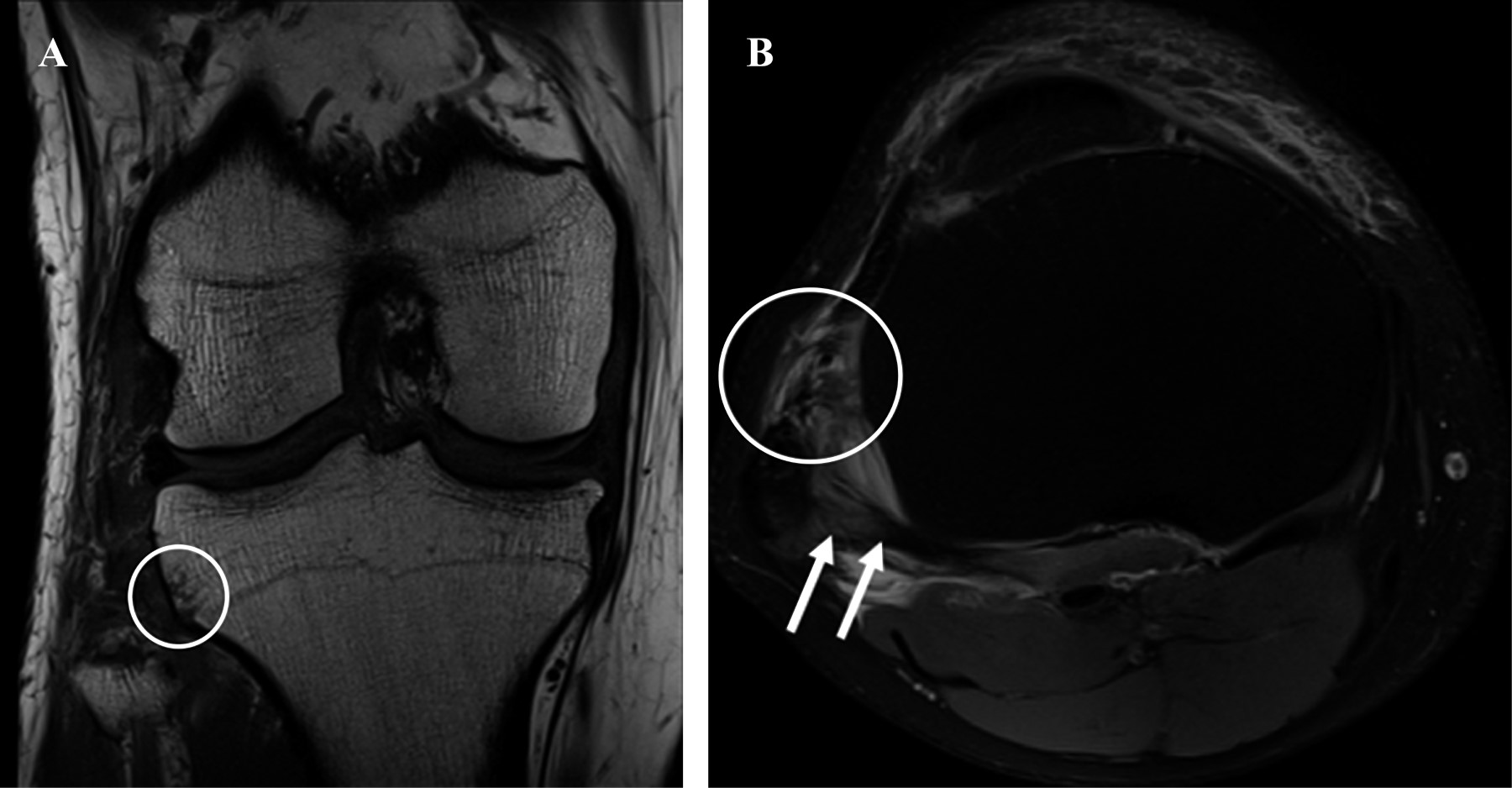 La resonancia magnética (RM) también puede asistir como imagen complementaria para la confirmación diagnóstica.8,21 Tiene la ventaja adicional de ser una excelente herramienta para evaluar partes blandas, permitiendo por un lado pesquisar lesiones ligamentarias asociadas a las LTFP y por el otro, ser de utilidad en el diagnóstico diferencial ante dudas diagnósticas.8,19,21 Sin embargo, tampoco se han descrito valores de normalidad para la articulación tibiofibular proximal en RM y tiene la desventaja de ser un recurso con accesibilidad limitada, eleva los costos y puede retrasar el diagnóstico.8
