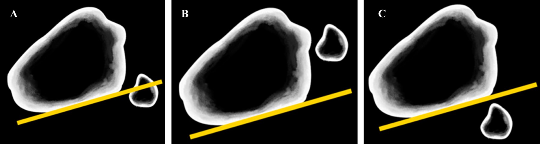 Otro aspecto a evaluar en la proyección lateral es la orientación anatómica de la fíbula. Se han descrito dos variaciones anatómicas: la variante horizontal (menor de 20o de inclinación en el plano horizontal) y la variante oblicua (mayor de 20o), que al tener una menor área de superficie articular predispone a una mayor inestabilidad (Figura 4).11
