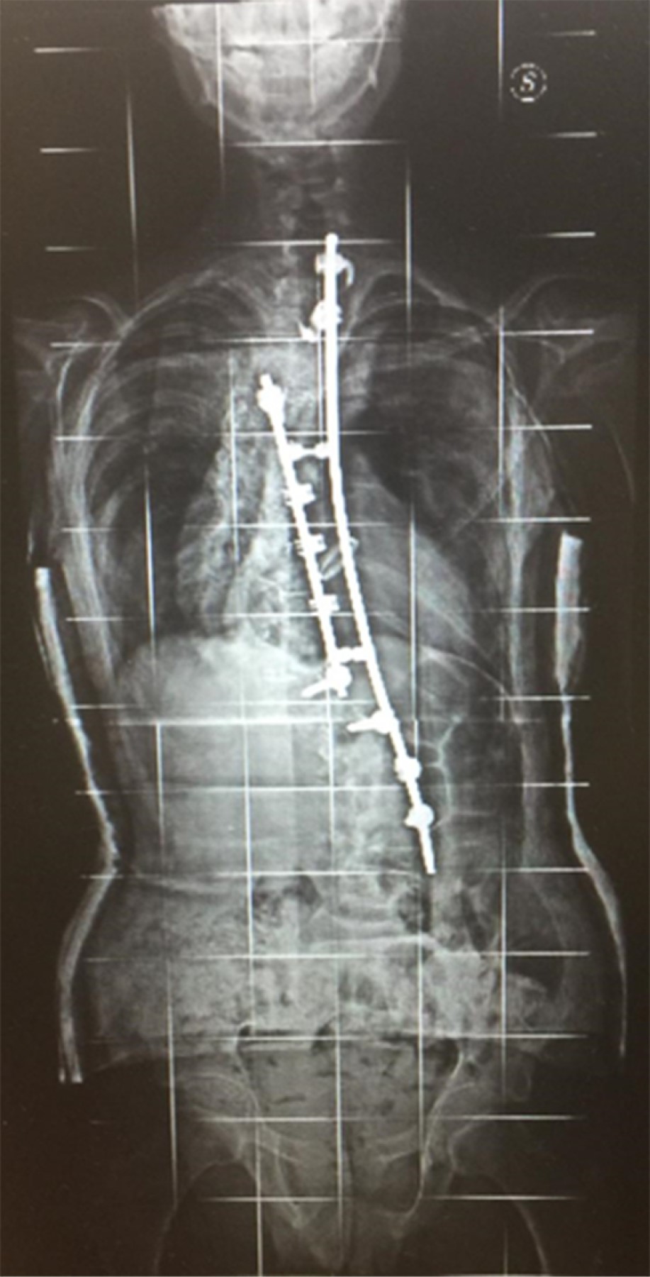 Parto a término controlado sin complicaciones prenatales ni perinatales. El peso al nacer fue de 4,400 g (DE 3.1) y la talla de 52 cm (DE 1.5). Se evidenció adecuado desarrollo sicomotor. Se mantiene en seguimiento por talla alta, hiperlaxitud ligamentaria (puntaje en la escala de Beighton 7/9), escoliosis de grado severo y progresivo con estudio de radiografía simple que describe curva escoliótica dextroconvexa a nivel dorsal, con ángulo de 102o (vértebra neutra D5-L1) y curva de compensación convexa izquierda a nivel lumbar de alrededor de 80o (vértebra neutra L1-L5), en posición lateral invariada la cifosis dorso-lumbar respecto a estudios previos. Posterior a intervención quirúrgica por rotoescoliosis dorso-lumbar dextroconvexa con presencia de dos barras metálicas estabilizadas con tornillos y ganchos. La curva escoliótica presenta un ángulo de alrededor de 53o (D4-L2) (Figura 1).