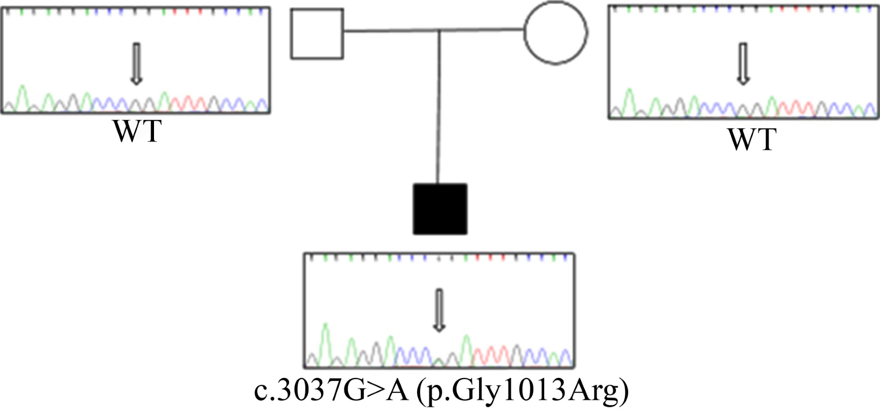 Basados en estos hallazgos, se indicó el estudio molecular por secuenciación directa (métodos estándar), que demostró una mutación heterocigota cambio de sentido (c.3037G>A; p.Gly225Arg) en el exón 24 del gen FBN1. Los padres y su hermana mayor no presentaron esta mutación (Figura 2). Se mantiene en monitoreo continuo por los servicios de ortopedia y traumatología, oftalmología, cardiología, imagenología, genética médica y pediatría. En terapia anticoagulante con warfarina posterior a intervención cardiovascular, con control periódico de exámenes de laboratorio cada 15 días. Además en fisioterapia con tratamiento de busto correctivo. Se contraindica actividad física intensa y esfuerzo excesivo ante la presencia de quiste pulmonar subpleural ante riesgo de neumotórax.