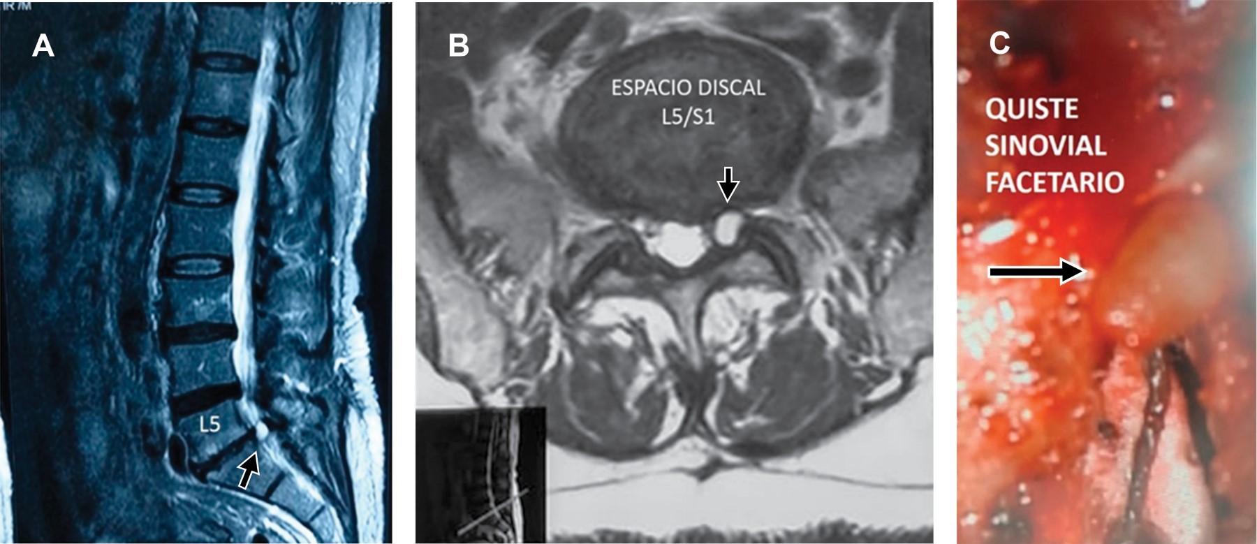 Masculino de 55 años acude por lumbalgia con compresión radicular S1 izquierda de un mes de evolución (Figura 1). Los quistes sinoviales facetarios (QSF) son lesiones degenerativas intraespinales y extradurales que se originan de la cápsula de la articulación facetaria; tienen una incidencia de 0.002 a 0.8%; se localizan (68.4%) a nivel de L4/L5; (21%) en L5/ S1; y 5% tanto en L1/L2 como en L2/L3. La serie más grande que se ha reportado es 194 casos. Los QSF se desarrollan por alteraciones biomecánicas; la presencia de espondilolistesis en 33% de los casos y la hipermovilidad en 60% de los pacientes son el principal factor etiológico en su formación. La mayoría de los pacientes con QSF se encuentran en la sexta década de la vida, con predominio femenino con relación 2:1. En la última década, con la resonancia magnética nuclear (RMN) se han incrementado los reportes. Los síntomas más comunes en QSF son: radiculopatía dolorosa (85%), claudicación de una raíz (44%), alteraciones de sensibilidad (43%) y paresia (en 27% de los casos), aunque también pueden presentarse manifestaciones de claudicación intermitente por estenosis espinal y más raramente síndrome de cauda equina (1-13%). Para su tratamiento, la cirugía ha demostrado ser el tratamiento definitivo; sin embargo, existen reportes de resolución con aspiración percutánea.