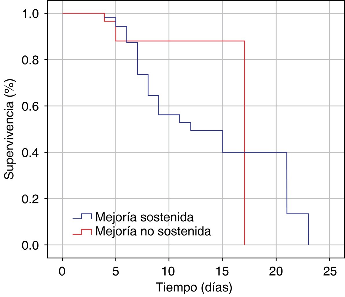 Análisis estadístico. La distribución de las variables cuantitativas se presenta como media (desviación estándar) y las variables cualitativas se expresan como frecuencia (porcentaje). Se construyó una curva Receiver Operating Characteristic (ROC) que evalúa el desempeño del "porcentaje de disminución de la PaO2/FiO2 al retiro del prono" para detección de mortalidad. El punto de corte se estableció en 50%. Se obtuvieron los valores del área bajo la curva (ABC) con intervalo de confianza de 95% (IC 95%) y valor de p. La muestra de dividió en dos grupos: mejoría sostenida al retiro del prono (< 50% de disminución de la PaO2/FiO2) y mejoría no sostenida al retiro del prono (> 50% de disminución de la PaO2/FiO2). Los grupos obtenidos se compararon utilizando la prueba t de Student o U de Mann Whitney según la distribución de las variables cuantitativas, normal y no normal respectivamente. Las variables cualitativas se compararon mediante la prueba de χ2 o exacta de Fisher, según corresponda. La supervivencia se evaluó mediante Kaplan-Meier y pruebas de Log-Rank. Consideramos valores de p < 0.05 para indicar significancia. Todos los análisis estadísticos se realizaron con el software SPSS versión 22.