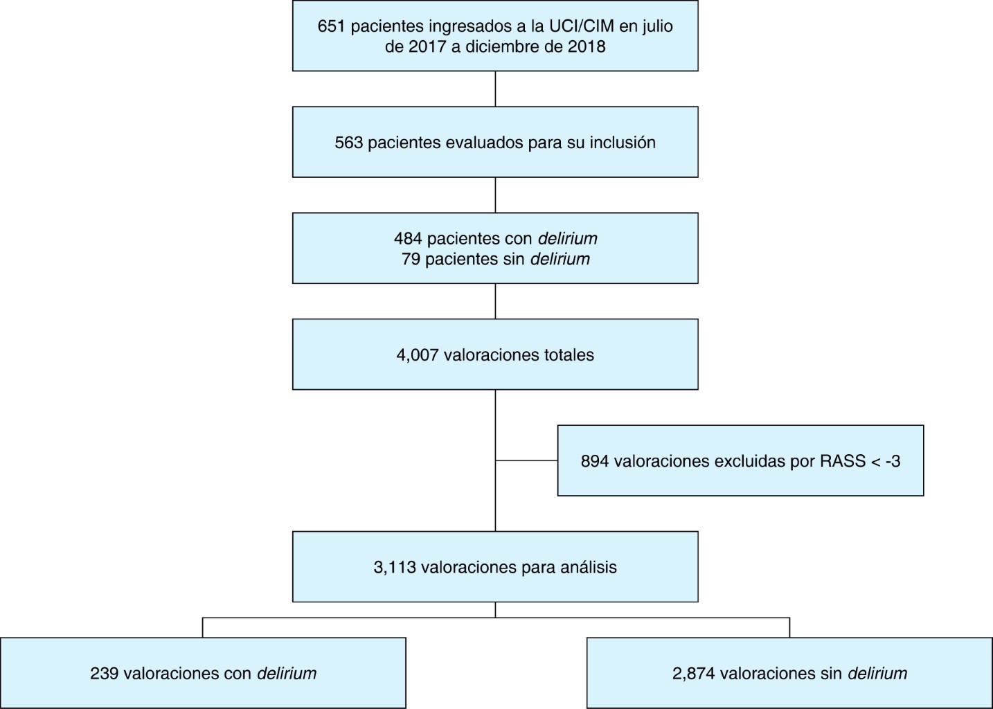 Se incluyeron pacientes mayores de 18 años de edad, de ambos sexos, atendidos en la UCI por cualquier indicación, que tuvieran valoración de riesgo de delirium a su ingreso y durante la estancia en la unidad. Se excluyeron aquellos con puntaje RASS (Richmond Agitation-Sedation Scale) que limitara la aplicación del instrumento de detección de delirium, y se eliminaron aquellos con datos incompletos al momento de la captura de datos.