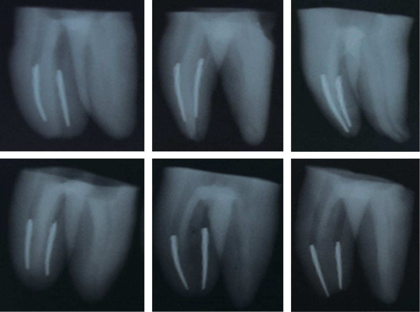 Terminada la fase de instrumentación se procedió a la fractura intencional de las limas. Se les hizo un desgaste mínimo en todas sus caras, los primeros 4 milímetros de la parte activa con la ayuda de una fresa troncocónica de carburo #2 (Figura 1), se llevaron al conducto radicular hasta alcanzar la longitud de trabajo previamente establecida y se activó el motor endodóncico para provocar la fractura de la lima a nivel apical de todas las muestras (Figura 2). Se tomaron radiografías oclusales (Carestream dental) para comprobar que la fractura de las limas se había producido correctamente en el tercio apical (Figura 3).