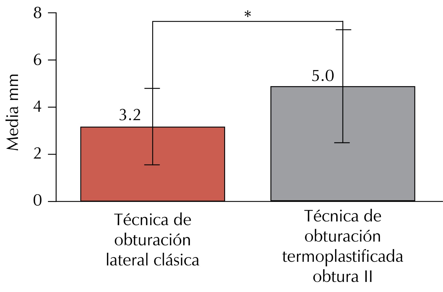 Los resultados obtenidos en el presente estudio con respecto a la microfiltración apical mostraron que el grupo en el cual se utilizó la técnica de obturación condensación lateral clásica presentó una filtración media de 3.2 ± 1.7 y el grupo de la técnica de obturación termoplastificada Obtura II mostró un valor medio de 5.0 ± 2.5 (Tabla 1 y Figura 4). Por lo tanto, al llevar a cabo una comparación de medias entre ambos grupos mediante la prueba t de Student para muestras independientes se encontró con suficiente evidencia estadística una mayor microfiltración apical en el grupo de Obtura II comparado con el grupo de condensación lateral clásica (p < 0.002).