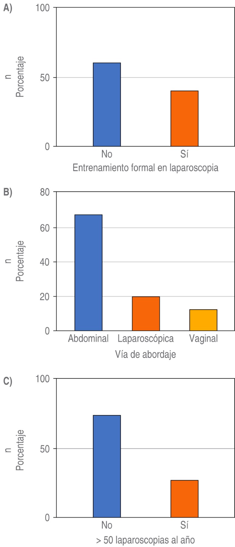 Con respecto al grupo A, 40% contaba con entrenamiento formal en laparoscopia y 27% de los médicos especialistas seleccionados realizan más de 50 laparoscopias al año, la vía quirúrgica de abordaje más común es la abdominal 67%, seguida de laparoscopia con 20% y vaginal con 13%, los resultados se muestran en la Figura 1A-C.