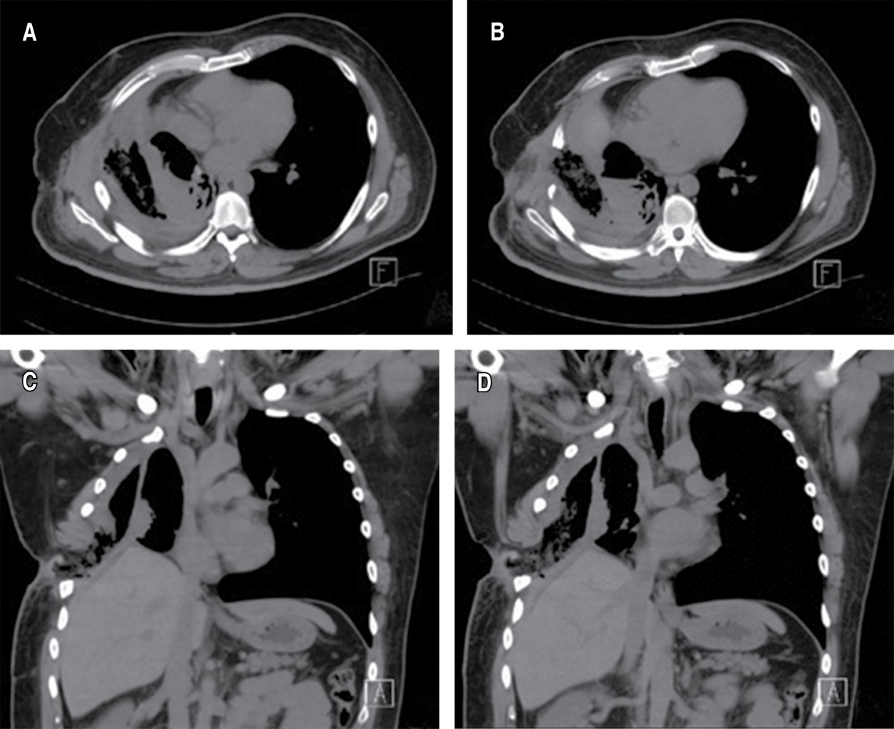 Hombre de 49 años, originario y residente del Estado de México, ocupación: personal de mudanza de equipos de lavandería en hospitales, cárceles y asilos, COMBE negativo, consumo de alcohol negado, tabaco a razón de un cigarrillo por día durante 21 años (IT 1.05). Antecedente de diabetes tipo 2 diagnosticado en 2005, tratado con insulina glargina 20 UI y metformina/glibenclamida. Tuberculosis pulmonar y pleural diagnosticada en mayo de 2017, tratado con IRPE durante un año, actualmente en remisión. Fístula broncopleural derecha de alto flujo y neumotórax espontáneo diagnosticado en junio de 2017, tratado con toracotomía y fistulectomía, ameritando una segunda intervención por persistencia; actualmente en remisión. Derrame pleural tratado con toracotomía y colocación de sonda en junio de 2017 por persistencia de derrame pleural; se realizó ventana torácica con técnica de Eloesser en octubre de 2017, en la actualidad en remisión y en espera de cierre quirúrgico. Fue referido al servicio de cirugía plástica el 17 de octubre de 2018 para valorar cierre de ventana pleural. A la exploración física se observó área cruenta de aproximadamente 6 × 7 cm en la región lateral de tórax derecho, cubierto con sistema de presión negativa, sin datos de fuga y con gasto serohemático. Tórax normolíneo, amplexión y amplexación asimétricas a expensas de hemitórax derecho, disminución de ruidos respiratorios y vibraciones vocales basales derechos, hemitórax izquierdo sin compromiso; el resto de la exploración sin anormalidades. Contaba con espirometría del 03 de octubre de 2018, que reportó evidencia de patrón restrictivo moderadamente severo, con una capacidad vital forzada (FVC) de 58.4 (Tabla 1) y tomografía de tórax realizada el 06 de octubre de 2018, que reportó ventana pulmonar con engrosamiento pleural y presencia de líquido heterogéneo, acompañado de neumotórax derecho (Figura 1 A-D). En el quirófano se realizó el 22 de octubre de 2018 cultivo, que no reportó crecimiento de patógenos y se decidió la colocación de sistema de presión negativa con esponja hidrofóbica de poliuretano. Cuatro días después se decidió realizar reconstrucción tardía mediante colgajo dorsal ancho pediculado para cierre de ventana pleural (Figura 2 A-F). El paciente evolucionó favorablemente, por lo cual fue dado de alta el 31 de octubre de 2018. Se dio seguimiento cuatro meses después de la cirugía, solicitando una espirometría, que reportó patrón restrictivo moderado (Tabla 2), con una FVC de 64.6, mostrando una mejoría de 11% comparado con el estudio previo y una tomografía de tórax donde se observaba el cierre de la ventana pleural (Figura 3 A y B).