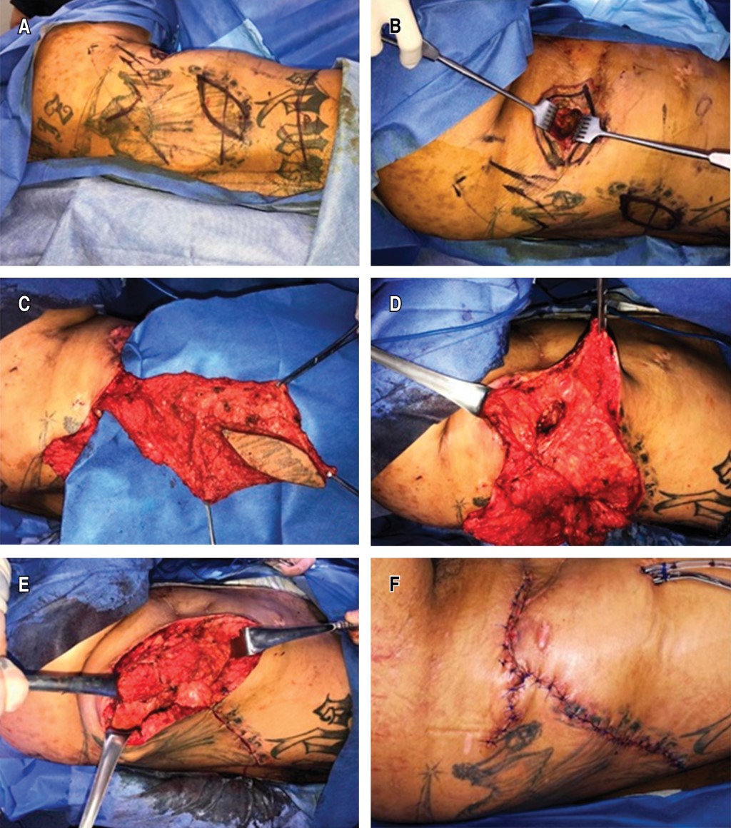 La reconstrucción de la pared torácica en pacientes con fístulas broncopleurales y empiema se puede lograr mediante tratamientos quirúrgicos como toracoplastia y transferencia de colgajo muscular. La toracoplastia ha demostrado ser un procedimiento de obturación confiable, pero, según se informa, sus desventajas incluyen escoliosis progresiva, dolor crónico, insuficiencia pulmonar progresiva y una apariencia estética mutilante, por lo que el procedimiento se ha vuelto obsoleto. Los colgajos musculares pediculados son ideales para llenar un espacio contaminado debido a la basta irrigación y capacidad para llegar a casi cualquier lugar del espacio pleural.18 Los músculos que se utilizan con mayor frecuencia son el dorsal ancho, serrato anterior, pectoral mayor y recto abdominal, para obliterar el espacio muerto y reforzar el muñón bronquial.19