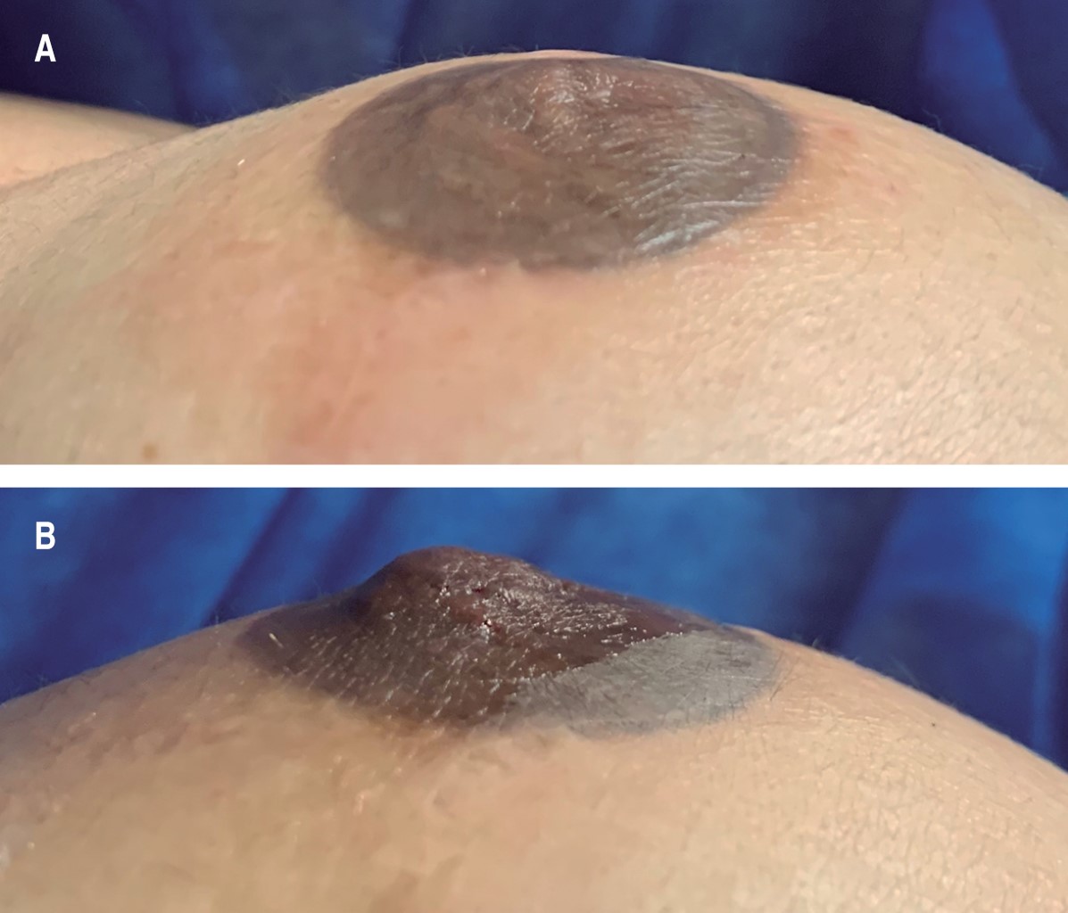 Mujer de 25 años con diagnóstico de carcinoma ductal infiltrante en mama derecha, quien fue sometida a MPPP y reconstrucción inmediata con expansor. La paciente no requirió de quimioterapia o radioterapia postoperatoria. Llevó a cabo el proceso de expansión tisular en forma ambulatoria y posteriormente se llevó a cabo el cambio de expansor por implante mamario y aplicación de lipoinjerto en el contorno de la mama y polo superior. La evolución clínica de la paciente fue adecuada; sin embargo, manifestó insatisfacción ante la asimetría en la proyección del pezón, por lo que se propuso la aplicación de ácido hialurónico. Después de firmar la carta de consentimiento informado se le aplicó 0.3 mL de ácido hialurónico reticulado de densidad media (Art Filler Universal, Laboratoires FILLMED, Francia) en la base del pezón, obteniendo una proyección de 4 mm (Figura 1) similar a la del pezón contralateral.