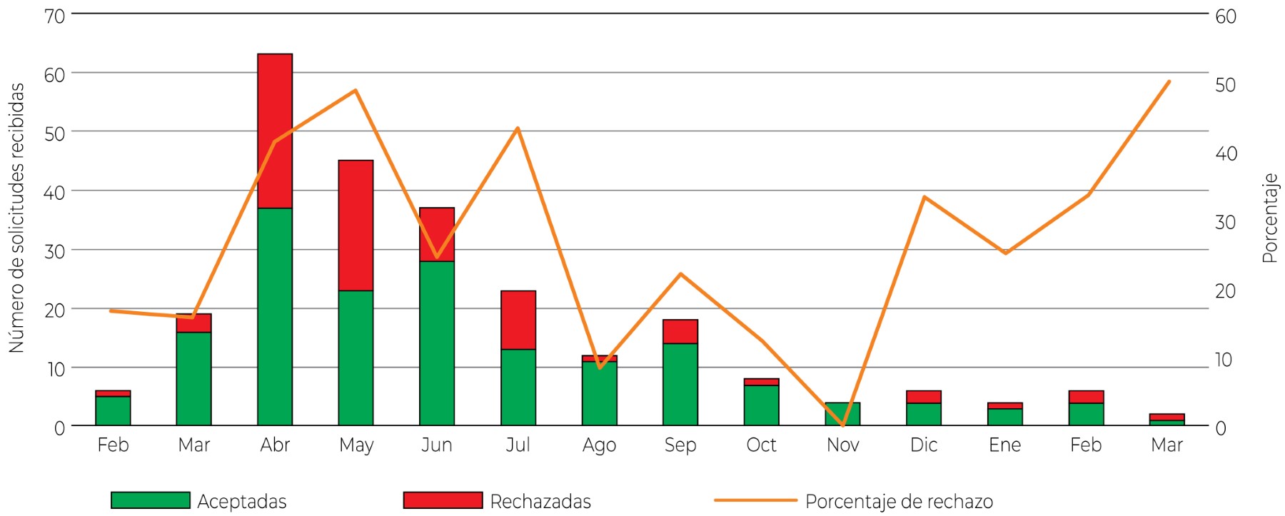 La primera solicitud para la evaluación de una prueba molecular para COVID-19 fue registrada en la GEPD del InDRE el 21 de febrero de 2020. A la fecha del corte realizado para este artículo, 16 de marzo de 2021, se sumaron 389 días de trabajo ininterrumpido con 253 solicitudes de evaluación recibidas. De ellas, 83 (32.8%) fueron rechazadas durante la revisión documental; la causa principal fue la duplicidad de la prueba con productos ya evaluados o en evaluación (43/83), seguida del incumplimiento en los requisitos establecidos en la convocatoria (34/83) y la deficiente presentación del producto (1/83). A partir de la apertura del servicio, la entrada de solicitudes creció rápidamente. Abril de 2020 fue el mes con mayor ingreso de solicitudes (63), de las cuales 59% cumplieron con todos los requisitos, el restante 41% de las pruebas fueron rechazadas en la revisión documental. Después de mayo, cuando la proporción de rechazos fue importante (49%), la adhesión de los solicitantes al listado de requisitos se mejoró. En los últimos cuatro meses sólo se recibieron pruebas moleculares multiplexadas para el diagnóstico diferencial de COVID-19 e influenza (Figura 1). Fueron aceptadas las 169 solicitudes que cubrieron los requisitos documentales. De acuerdo con los procedimientos vigentes, esta revisión fue dictaminada por el Comité de Evaluación del InDRE, que fue suspendido a partir del 10 de abril del mismo año, asignándose esta responsabilidad a la GEPD. Durante este paso fueron canceladas 29 solicitudes por los interesados.