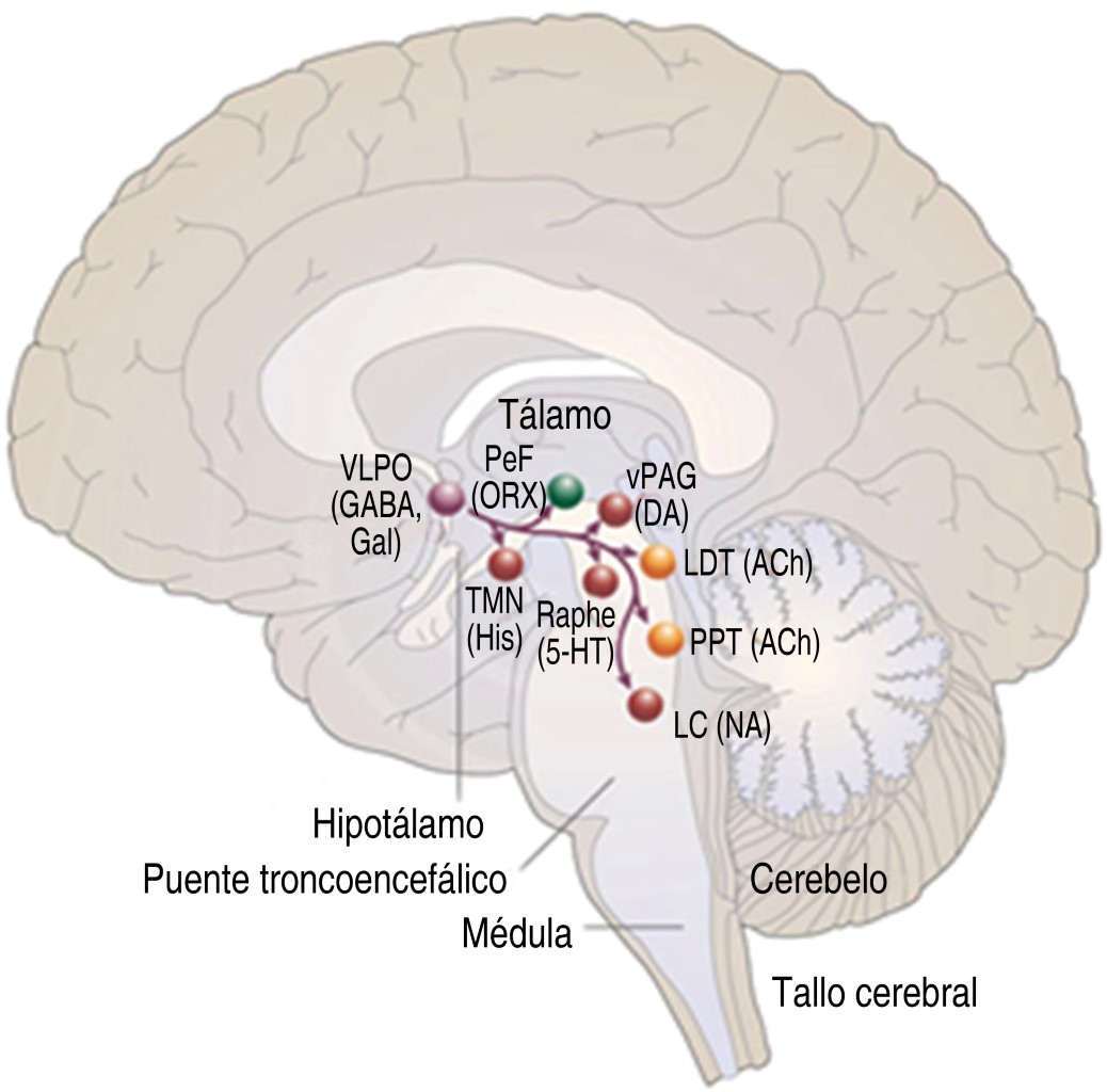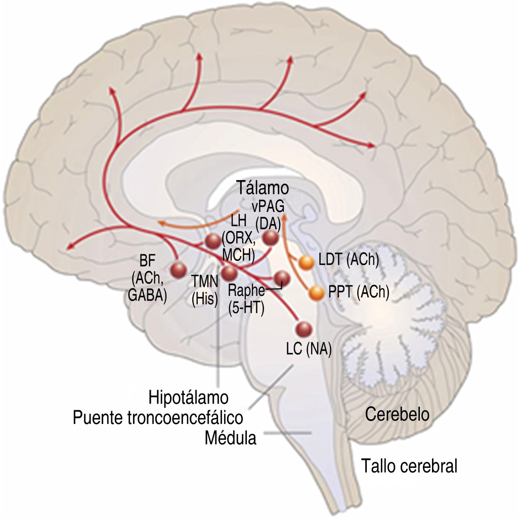 La función propia del SARA se realiza a través de dos vías; la primera tiene como destino final el tálamo y comprende la acción de dos núcleos: el tegmento pedúnculo pontino y el laterodorsal, ambos colinérgicos. Las neuronas en esta área disparan rápidamente durante el estado de despierto; la segunda rama se origina en las neuronas monoaminérgicas localizadas en la parte superior del tallo cerebral y del hipotálamo. Este sistema comprende al locus coeruleus, el cual es noradrenérgico y los núcleos del rafe que son serotoninérgicos. También incluye parte de la substancia gris periacueductal, la cual es dopaminérgica y las neuronas tuberomamilares hipotalámicas que son histaminérgicas. Esta vía activa las neuronas del área hipotalámica lateral y de la base del lóbulo frontal de donde parte la activación a toda la corteza cerebral. Las lesiones de estas dos últimas estructuras causan sueño profundo y coma(5) (Figura 1).
