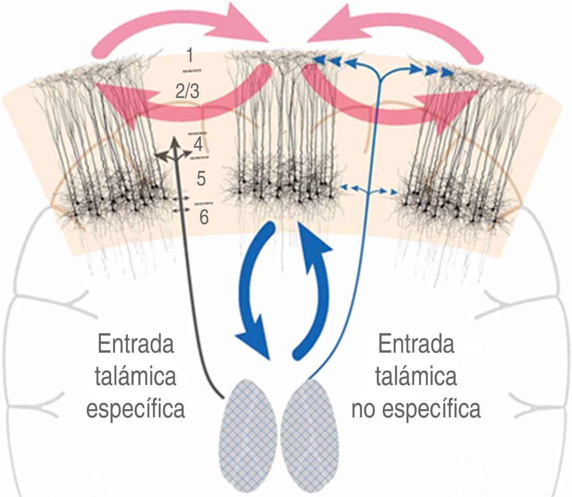 En las diferentes teorías del origen y mantenimiento de la consciencia, hay un punto de convergencia basado en que tanto el sistema inespecífico tálamo-cortical como los procesos córtico-corticales se intersectan en la capa V de la corteza cerebral, lo que permite que las fibras tálamo-corticales disparen y promuevan con su descarga proveniente del tálamo, la comunicación córtico-cortical, fundamental en la creación del estado de consciencia. El intercambio de información está importantemente influenciado por la acción del núcleo reticular que modula y administra el flujo de datos que fluyen de manera constante de y hacia el tálamo(13) (Figura 4).