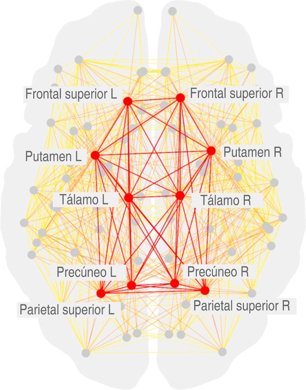En la parte más alta de la jerarquía de las conexiones privilegiadas están los nodos concentradores principales de la red o "club de ricos" (rich club) en atención a la cantidad enorme de información que reciben y a su vez procesan. Estos nodos densamente interconectados fundamentan el funcionamiento cerebral competente. Se han detectado clubes de ricos a nivel bilateral en regiones frontoparietales en la región de la precuña, del cíngulo, junto con otras regiones subcorticales como el hipocampo, el tálamo y el putamen. Estos clubes a su vez están densamente interconectados entre sí como una parte esencial del conectoma humano(28-30) (Figura 6).