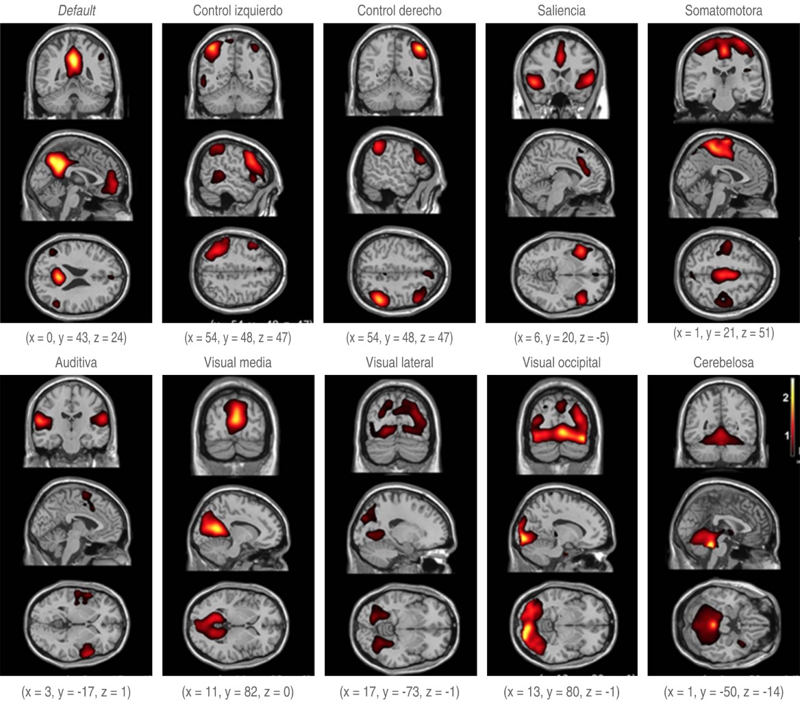 - 1. Red de default o frontoparietal medial: incluye las cortezas prefrontal media, posterior del cíngulo y parietal inferior junto con el hipocampo. Tiene como labor la recolección de recuerdos, imaginación, planes a futuro y divagaciones mentales.