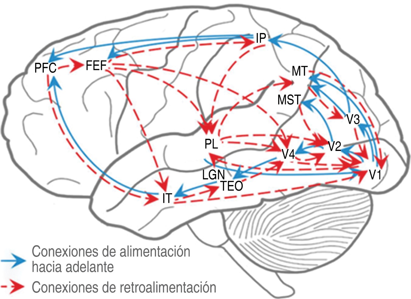 - 6. Redes visuales: divididas en medial, lateral y occipital. Las áreas que la constituyen se encuentran principalmente en el lóbulo occipital, pero también están las áreas visuales laterales, el cuerpo estriado y el núcleo lateral geniculado del tálamo y la corteza prefrontal.